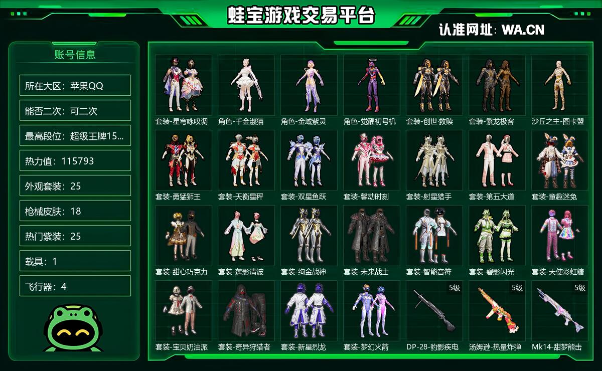 苹果QQ 可二次 当前段位不朽星钻Ⅴ 历史最高段位超级王牌15星 热力值115793 等级64 套装253 王牌次数16 点券5 外观套装25 枪械皮肤18 热门紫装25 载具1 飞行器4 稀有0 头盔3 背包5