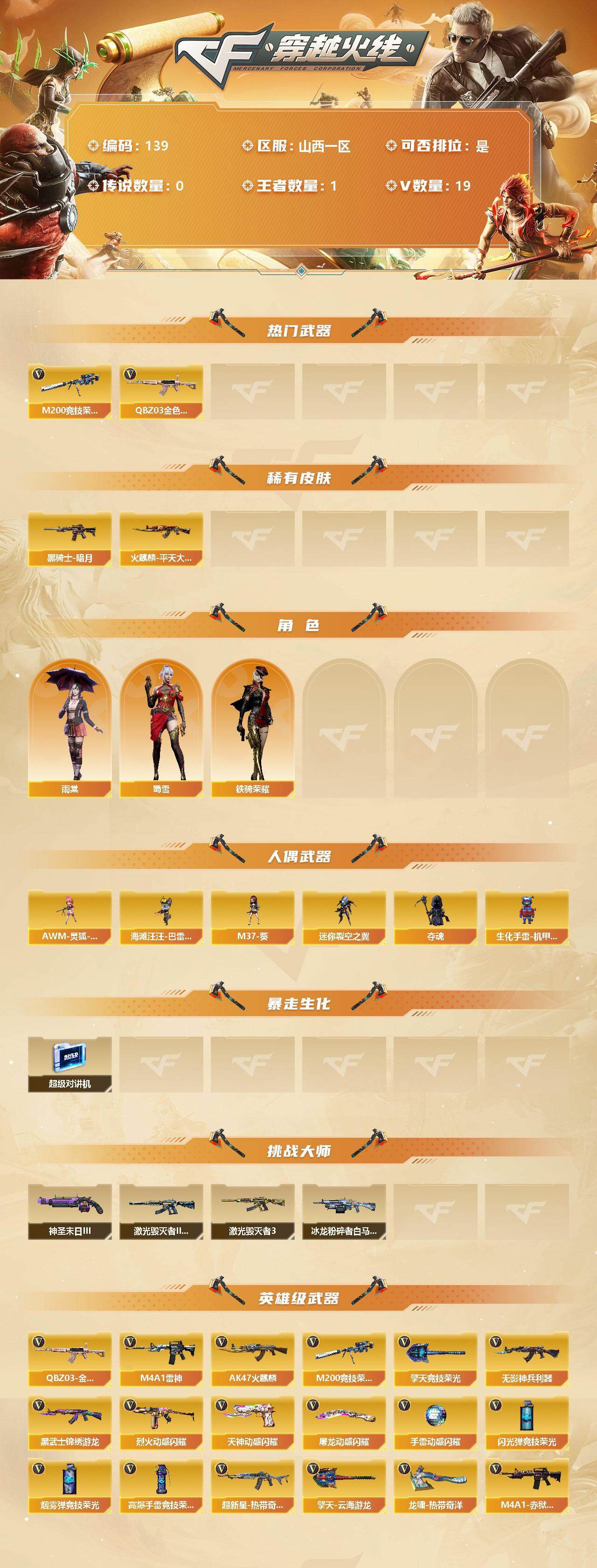 [12186549]【139】18V/102级/荣耀元首/1王者/1英雄/QBZ03-金色蔷薇/M200-竞技荣光/火麒麟-平天大圣/黑骑士-暗月/雨棠/蜀雪/铁骑荣耀/AWM-灵狐-15周年嘉年华/海滩汪汪-巴雷特/M37-葵/迷你裂空之翼/夺魂/生化手雷-机甲核心/超级对讲机/神圣爆裂者-末日/激光毁灭者/激光毁灭者III-白马银枪/冰龙粉碎者-白马银枪/擎天-竞技荣光/高爆手雷-竞技荣光/烟雾弹-竞技荣光/闪光弹-竞技荣光/烈火-动感闪耀/天神-动感闪耀/屠龙-动感闪耀/手雷-动感闪耀/无影-神兵利器/M4A1-雷神/AK47-火麒麟/AK47-黑武士-锦绣游龙/超新星-热带奇洋/M4A1-赤狱骑士/擎天-云海游龙/龙啸-热带奇洋