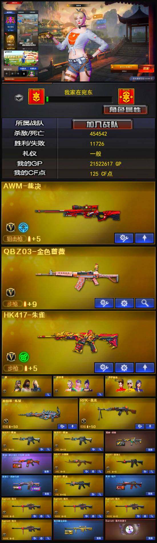 【热门武器】:QBZ03-金色蔷薇,HK417-朱雀,M4A1-黑骑士,RPK-盘龙,加特林-炼狱,沙鹰-修罗*4