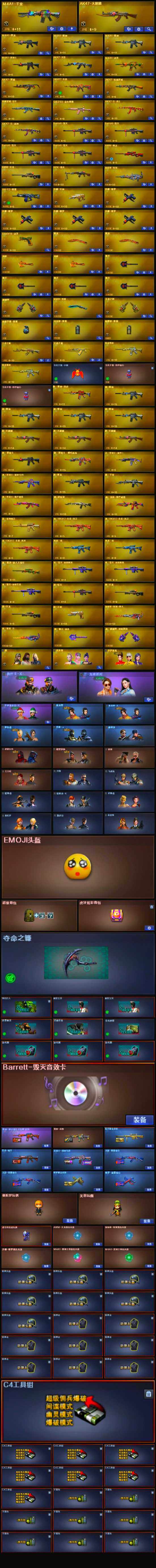 【英雄级武器】:M4A1-武圣,Glock18-武圣,QBZ03-金色蔷薇,HK417-朱雀,M4A1-雷神*2,M4A1-黑龙,M4A1-黑骑士,RPK-盘龙,加特林-炼狱,AK47-无影,AK47-火麒麟,AWM-天龙,Barrett-毁灭*4,AWM-裁决,AK47-机械迷城,AA-12-雷霆,AK47-黑鲨,M4A1-千变,AK-47-猩红传说*5,AK47-B-战神,M4A1-赤狱骑士,沙鹰-天神,沙鹰-修罗*4,麒麟刺,擎天*4,龙啸*2,屠龙*2