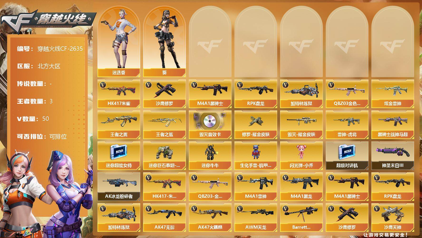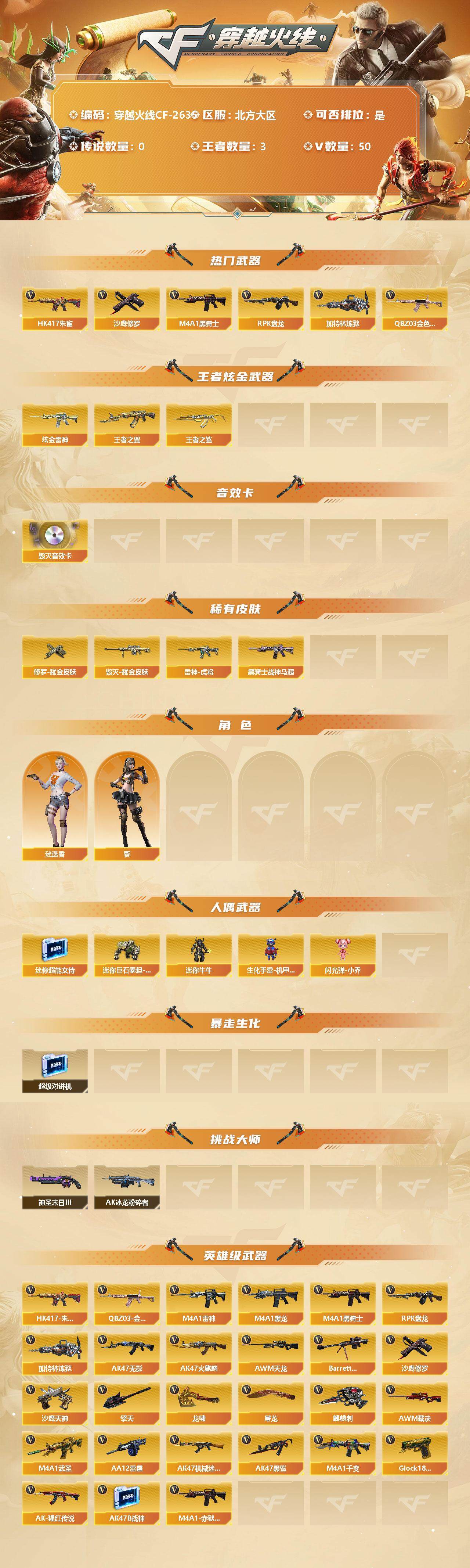 [12079137]【商品标题】:北方大区-50V-3王者-2炫金 【热门武器】:QBZ03-金色蔷薇,HK417-朱雀,M4A1-黑骑士,RPK-盘龙,加特林-炼狱,沙鹰-修罗*4 【王者炫金武器】:炫金雷神*2,王者之鲨,王者之翼 【音效卡】:Barrett-毁灭音效卡 【稀有皮肤】:雷神-虎将,黑骑士-战神马超,毁灭耀金皮肤,修罗耀金皮肤 【角色】:葵,迷迭香 【人偶武器】:迷你超能女侍,迷你巨石泰坦-魔花研究所,迷你牛牛,生化手雷-机甲核心*2,闪光弹-小乔 【暴走生化】:超级对讲机 【挑战大师】:神圣爆裂者-末日III,AK47-冰龙粉碎者 【英雄级武器】:M4A1-武圣,Glock18-武圣,QBZ03-金色蔷薇,HK417-朱雀,M4A1-雷神*2,M4A1-黑龙,M4A1-黑骑士,RPK-盘龙,加特林-炼狱,AK47-无影,AK47-火麒麟,AWM-天龙,Barrett-毁灭*4,AWM-裁决,AK47-机械迷城,AA-12-雷霆,AK47-黑鲨,M4A1-千变,AK-47-猩红传说*5,AK47-B-战神,M4A1-赤狱骑士,沙鹰-天神,沙鹰-修罗*4,麒麟刺,擎天*4,龙啸*2,屠龙*2 【特殊枪械】:1黑骑士,1盘龙,1炼狱