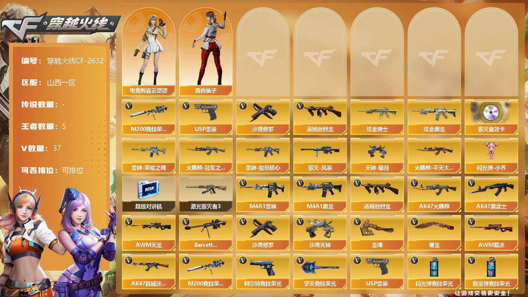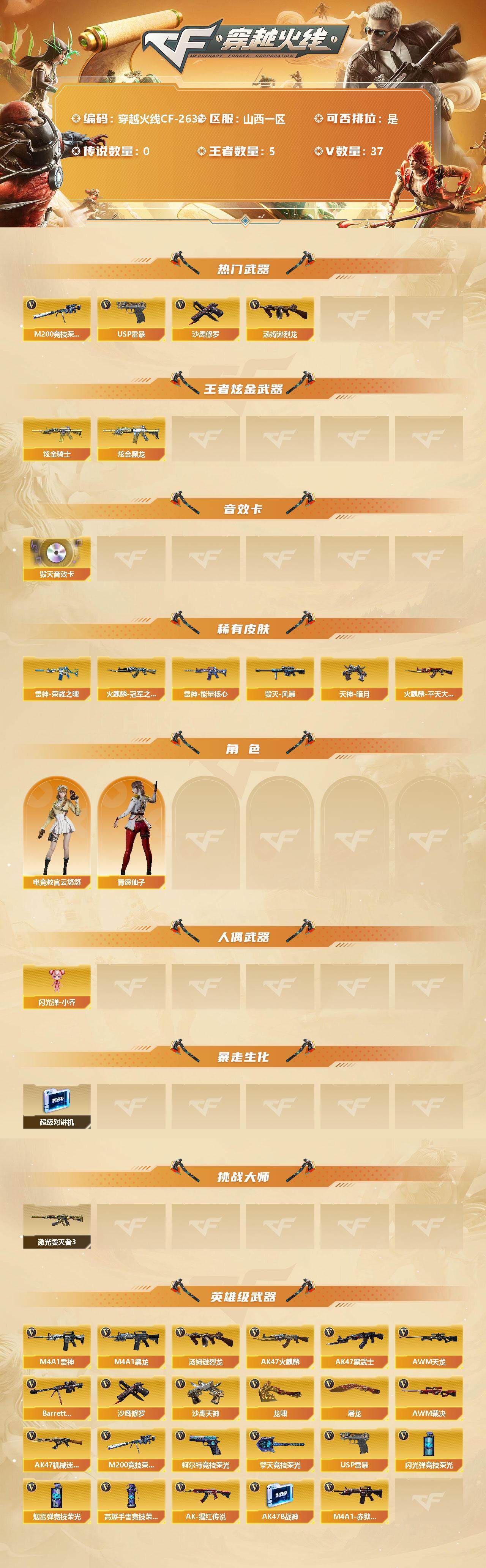 [12078984]【商品标题】:山西一区-37V-5王者-2炫金 【热门武器】:M200-竞技荣光,汤姆逊-烈龙,USP-雷暴,沙鹰-修罗 【王者炫金武器】:炫金骑士,炫金黑龙 【音效卡】:Barrett-毁灭音效卡 【稀有皮肤】:雷神-能量核心,雷神-荣耀之魄,火麒麟-冠军之心,火麒麟-平天大圣,毁灭-风暴,天神-暗月*2 【角色】:电竞教官-云悠悠,青霞仙子 【人偶武器】:闪光弹-小乔 【暴走生化】:超级对讲机 【挑战大师】:激光毁灭者III 【英雄级武器】:M200-竞技荣光,柯尔特-竞技荣光*2,擎天-竞技荣光,高爆手雷-竞技荣光*3,烟雾弹-竞技荣光*3,闪光弹-竞技荣光*3,USP-雷暴,M4A1-雷神*2,M4A1-黑龙,汤姆逊-烈龙,AK47-火麒麟,AK47-黑武士,AWM-天龙,Barrett-毁灭,AWM-裁决,AK47-机械迷城,AK-47-猩红传说,AK47-B-战神,M4A1-赤狱骑士,沙鹰-天神,沙鹰-修罗,龙啸,屠龙*2 【特殊枪械】:1烈龙