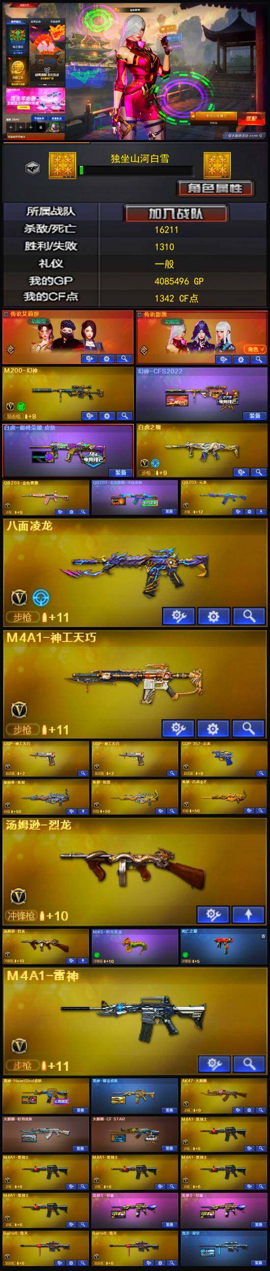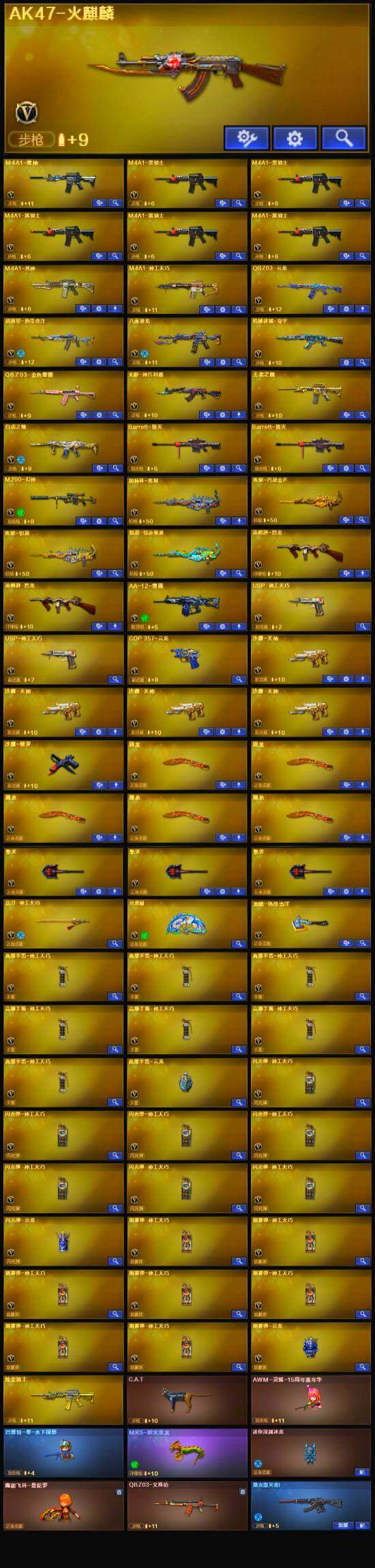 【英雄级武器】:QBZ03-云龙,COP 357-云龙,M4A1-神工天巧,USP-神工天巧*2,唐刀-神工天巧,QBZ03-金色蔷薇,八面凌龙,无影-神兵利器,M4A1-雷神,M4A1-黑骑士*5,M4A1-死神,加特林-炼狱,汤姆逊-烈龙*2,AK47-火麒麟,Barrett-毁灭*2,AA-12-雷霆,M200-幻神,超新星-热带奇洋,沙鹰-天神*4,沙鹰-修罗,擎天*3,屠龙*5,龙啸-热带奇洋