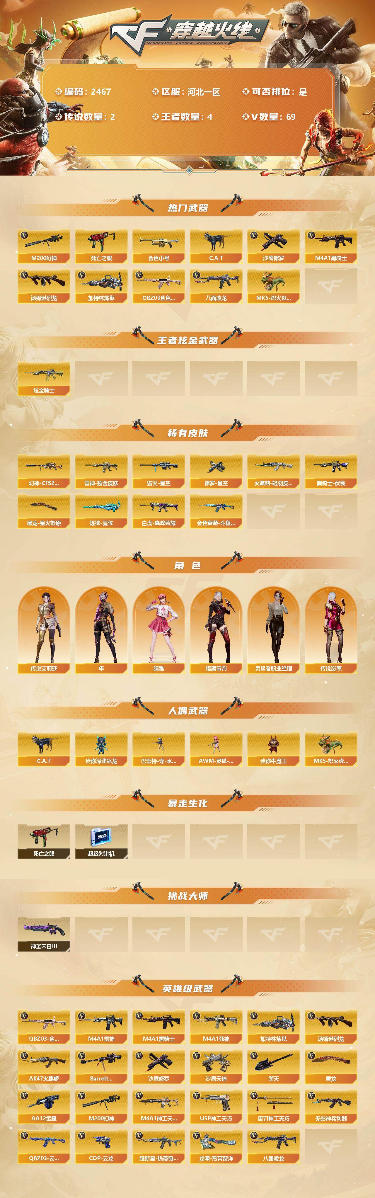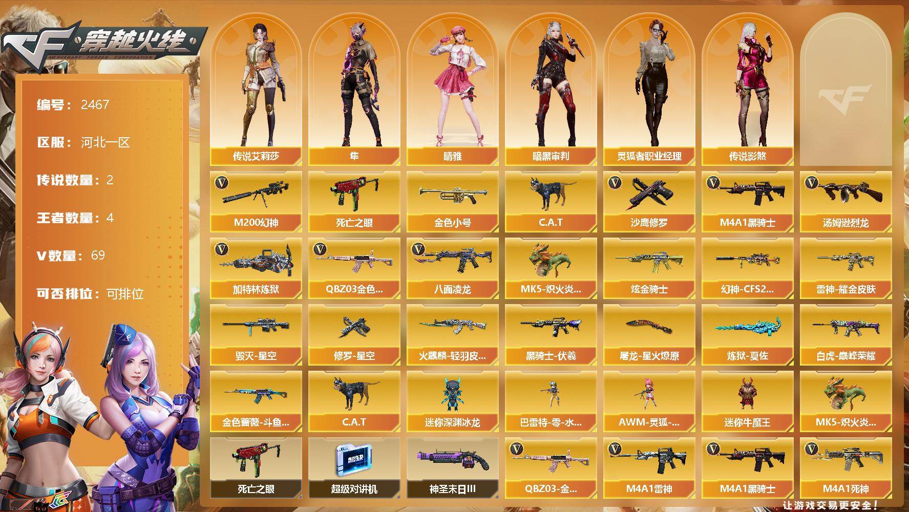 [12119257]【商品标题】:河北一区-69V-4王者-1炫金 【传说角色】:传说影煞,传说艾莉莎 【热门武器】:QBZ03-金色蔷薇,M200-幻神,八面凌龙,死亡之眼,金色小号,C.A.T,M4A1-黑骑士*5,汤姆逊-烈龙*2,加特林-炼狱,MK5-炽火炎龙,沙鹰-修罗 【王者炫金武器】:炫金骑士 【稀有皮肤】:幻神-CFS2022,白虎-巅峰荣耀 皮肤,QBZ03-金色蔷薇-斗鱼皮肤,雷神-耀金皮肤,火麒麟-轻羽皮肤,黑骑士-伏羲*2,毁灭-星空,炼狱-夏佐 皮肤,修罗-星空,屠龙-星火燎原 【角色】:传说影煞,传说艾莉莎,灵狐者-职业经理,晴雅,隼,暗黑审判 【人偶武器】:MK5-炽火炎龙,巴雷特-零-水下丽影,AWM-灵狐-15周年嘉年华,C.A.T,迷你深渊冰龙,迷你牛魔王 【暴走生化】:死亡之眼,超级对讲机 【挑战大师】:神圣爆裂者-末日III 【英雄级武器】:QBZ03-云龙,COP 357-云龙,M4A1-神工天巧,USP-神工天巧*2,唐刀-神工天巧,QBZ03-金色蔷薇,八面凌龙,无影-神兵利器,M4A1-雷神,M4A1-黑骑士*5,M4A1-死神,加特林-炼狱,汤姆逊-烈龙*2,AK47-火麒麟,Barrett-毁灭*2,AA-12-雷霆,M200-幻神,超新星-热带奇洋,沙鹰-天神*4,沙鹰-修罗,擎天*3,屠龙*5,龙啸-热带奇洋 【特殊枪械】:5黑骑士,2烈龙,1炼狱