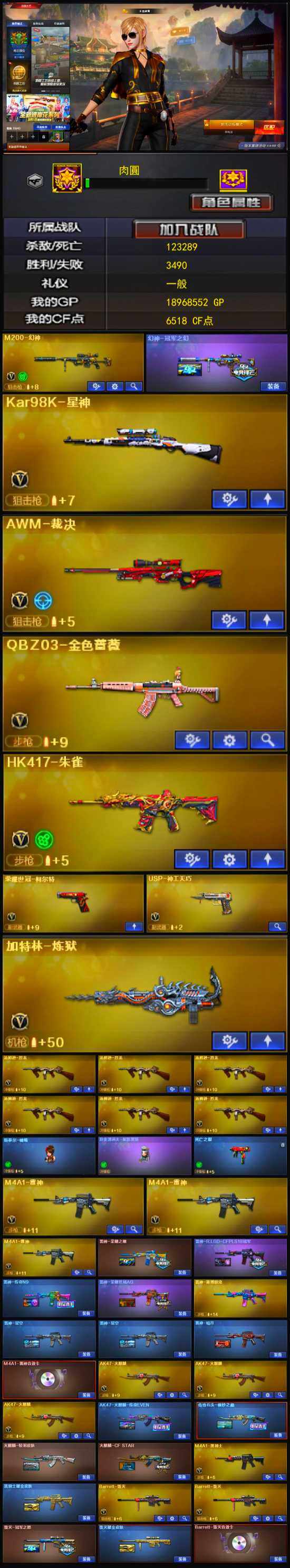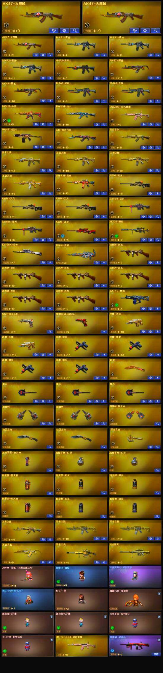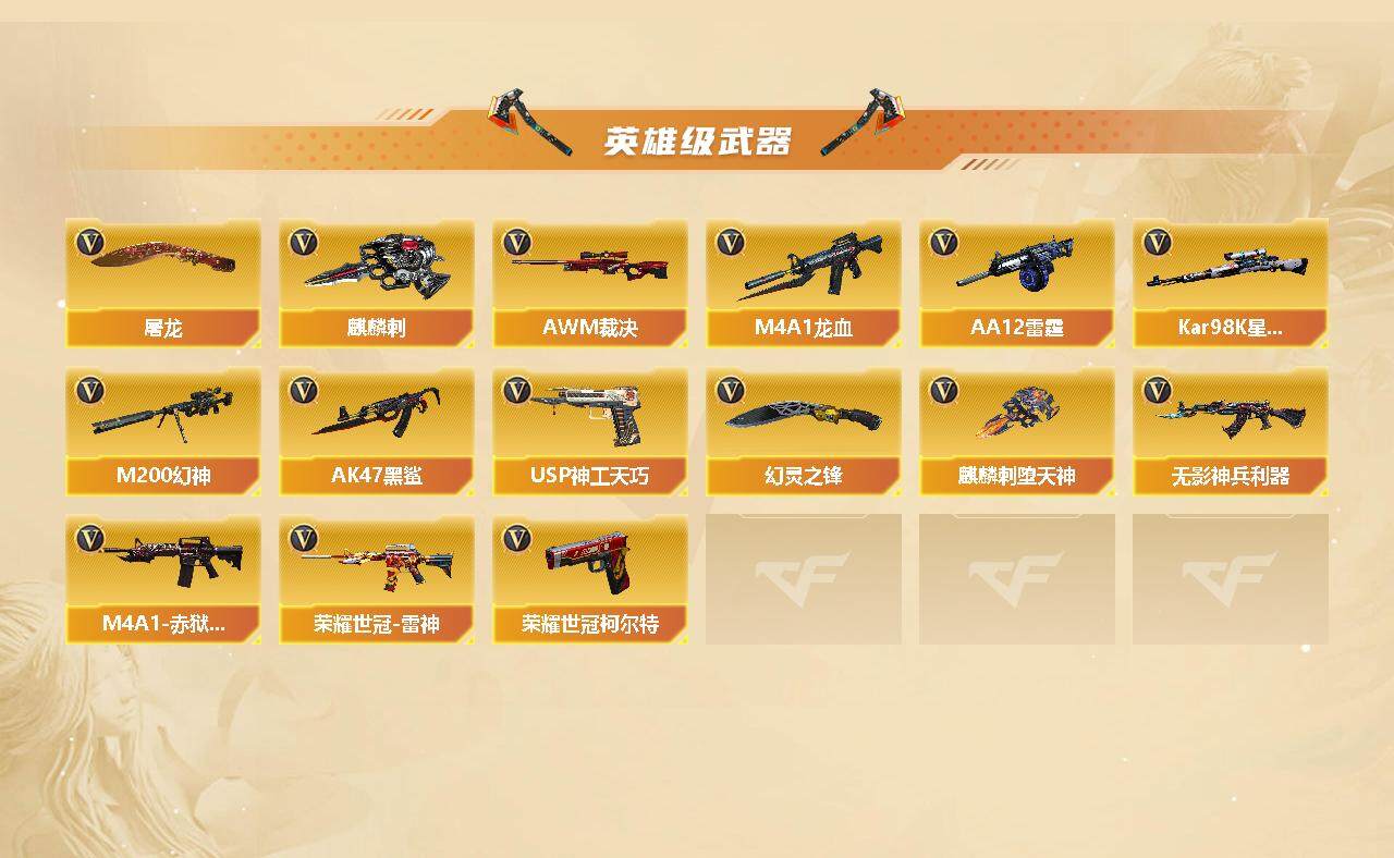 【英雄级武器】:USP-神工天巧,幻灵之锋*2,麒麟刺-堕天神,荣耀世冠-雷神,荣耀世冠-柯尔特,QBZ03-金色蔷薇,HK417-朱雀,无影-神兵利器,M4A1-雷神*3,M4A1-黑骑士,加特林-炼狱,汤姆逊-烈龙*6,AK47-火麒麟*3,AWM-天龙*3,Barrett-毁灭*2,AWM-裁决,M4A1-龙血*2,AA-12-雷霆,Kar98K-星神,M200-幻神,AK47-黑鲨*2,M4A1-赤狱骑士,沙鹰-天神*2,沙鹰-修罗*4,麒麟刺*2,擎天*3,屠龙