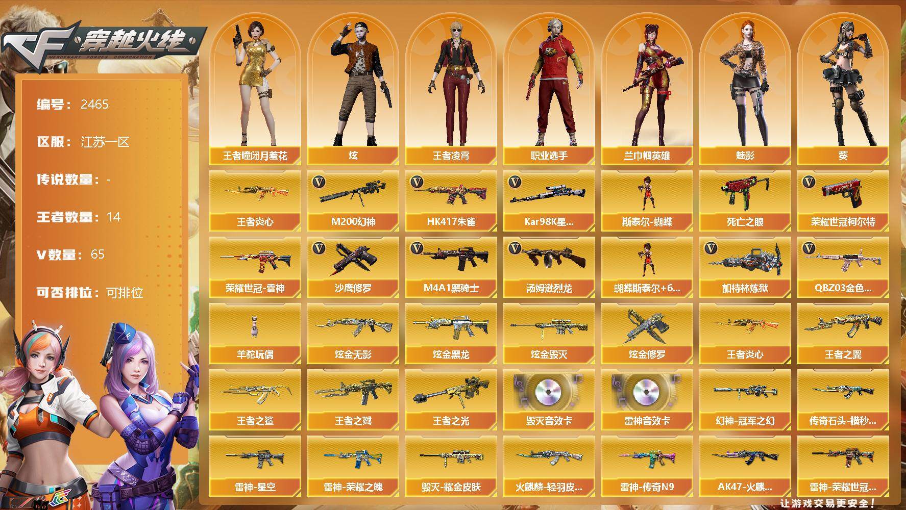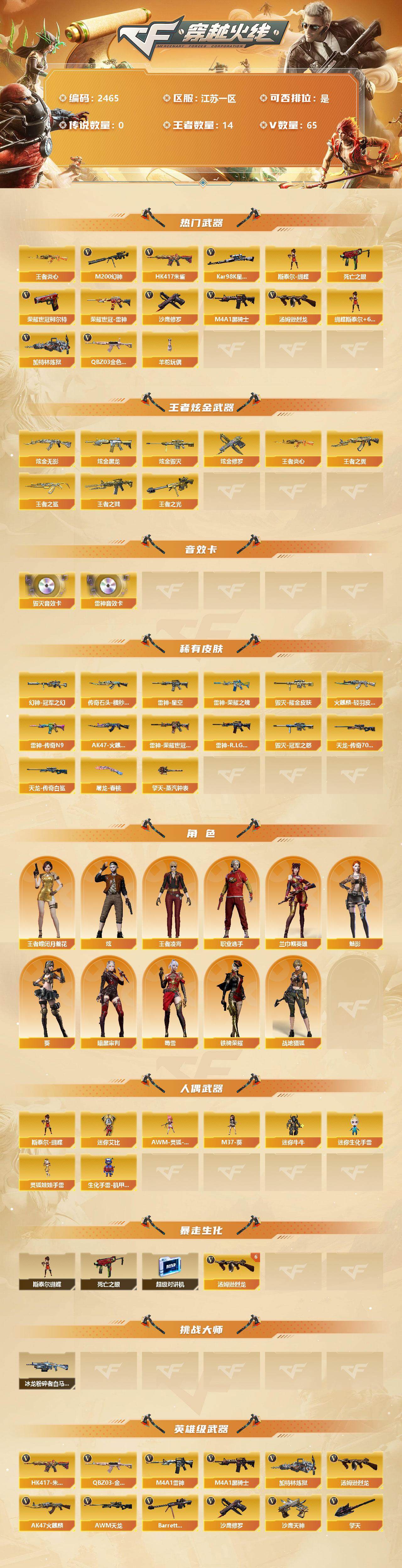 [12119360]【商品标题】:江苏一区-65V-14王者-5炫金 【热门武器】:QBZ03-金色蔷薇,HK417-朱雀,M200-幻神,死亡之眼,荣耀世冠-雷神,荣耀世冠-柯尔特,王者炎心,Kar98K-星神,M4A1-黑骑士,汤姆逊-烈龙*6,加特林-炼狱,斯泰尔-蝴蝶,羊驼玩偶,沙鹰-修罗*4 【王者炫金武器】:炫金无影,炫金黑龙,炫金毁灭,炫金修罗*2,王者炎心,王者之鲨,王者之戮*2,王者之翼,王者之光 【音效卡】:M4A1-雷神音效卡,Barrett-毁灭音效卡 【稀有皮肤】:幻神-冠军之幻,雷神-荣耀之魄,雷神-星空*2,雷神-传奇N9,雷神-R.LGD-CFPLS18冠军,雷神-荣耀世冠AG,AK47-火麒麟-传奇EVEN,火麒麟-轻羽皮肤,传奇石头-横秒之巅,毁灭耀金皮肤,毁灭-冠军之怒,AWM-天龙-传奇70KG,AWM-天龙-传奇白鲨,屠龙-春桃 皮肤,擎天-蒸汽钟表 皮肤 【角色】:王者-瞳-闭月羞花,王者凌霄,葵,魅影,炫,兰-巾帼英雄,战地猎狐,蜀雪,铁骑荣耀,职业选手,暗黑审判 【人偶武器】:斯泰尔-蝴蝶,AWM-灵狐-15周年嘉年华,M37-葵,迷你艾比,迷你牛牛,迷你生化手雷*2,灵狐娃娃手雷,生化手雷-机甲核心*2 【暴走生化】:斯泰尔-蝴蝶,死亡之眼,超级对讲机 【挑战大师】:冰龙粉碎者-白马银枪*3 【英雄级武器】:USP-神工天巧,幻灵之锋*2,麒麟刺-堕天神,荣耀世冠-雷神,荣耀世冠-柯尔特,QBZ03-金色蔷薇,HK417-朱雀,无影-神兵利器,M4A1-雷神*3,M4A1-黑骑士,加特林-炼狱,汤姆逊-烈龙*6,AK47-火麒麟*3,AWM-天龙*3,Barrett-毁灭*2,AWM-裁决,M4A1-龙血*2,AA-12-雷霆,Kar98K-星神,M200-幻神,AK47-黑鲨*2,M4A1-赤狱骑士,沙鹰-天神*2,沙鹰-修罗*4,麒麟刺*2,擎天*3,屠龙 【特殊枪械】:蝴蝶斯泰尔+6烈龙,1黑骑士,6烈龙,1炼狱,1蝴蝶斯泰尔