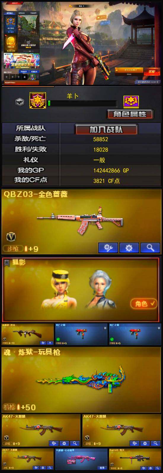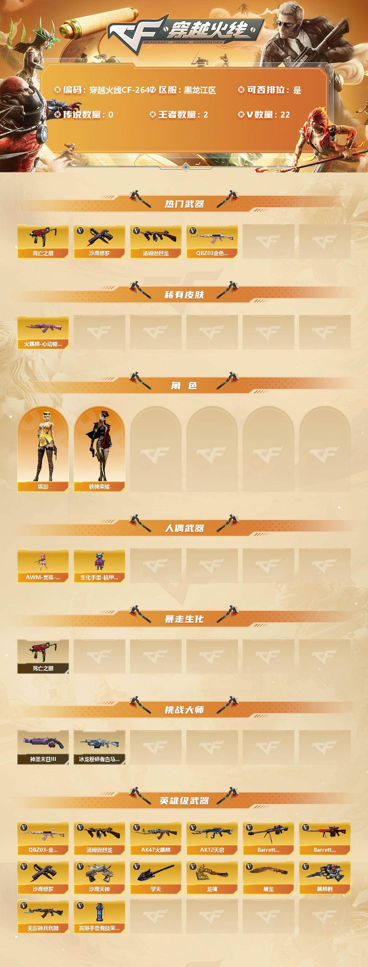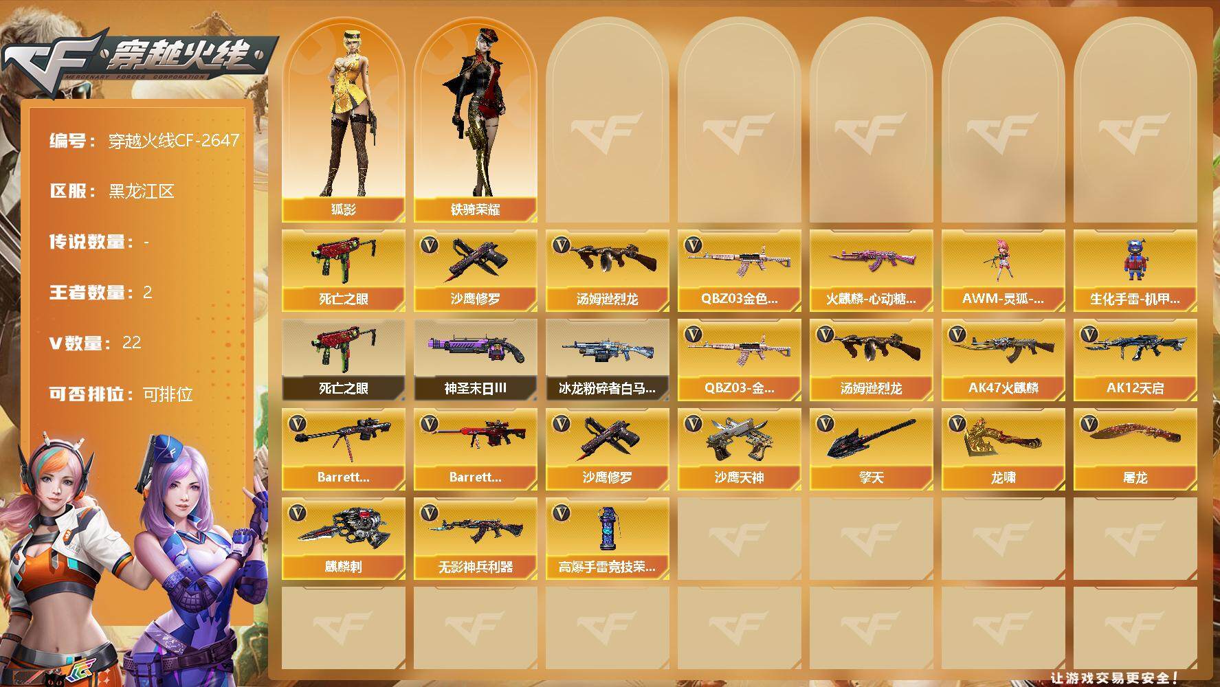 [12104223]【商品标题】:黑龙江区-22V-2王者-0炫金 【热门武器】:QBZ03-金色蔷薇,死亡之眼*2,汤姆逊-烈龙,沙鹰-修罗 【稀有皮肤】:火麒麟-心动糖果 【角色】:狐影,铁骑荣耀 【人偶武器】:AWM-灵狐-15周年嘉年华,生化手雷-机甲核心 【暴走生化】:死亡之眼*2 【挑战大师】:神圣爆裂者-末日III,冰龙粉碎者-白马银枪 【英雄级武器】:高爆手雷-竞技荣光,QBZ03-金色蔷薇,无影-神兵利器,汤姆逊-烈龙,AK47-火麒麟*3,AK12-天启,Barrett-毁灭,Barrett-极光,沙鹰-天神*2,沙鹰-修罗,麒麟刺,擎天,龙啸,屠龙 【特殊枪械】:1烈龙
