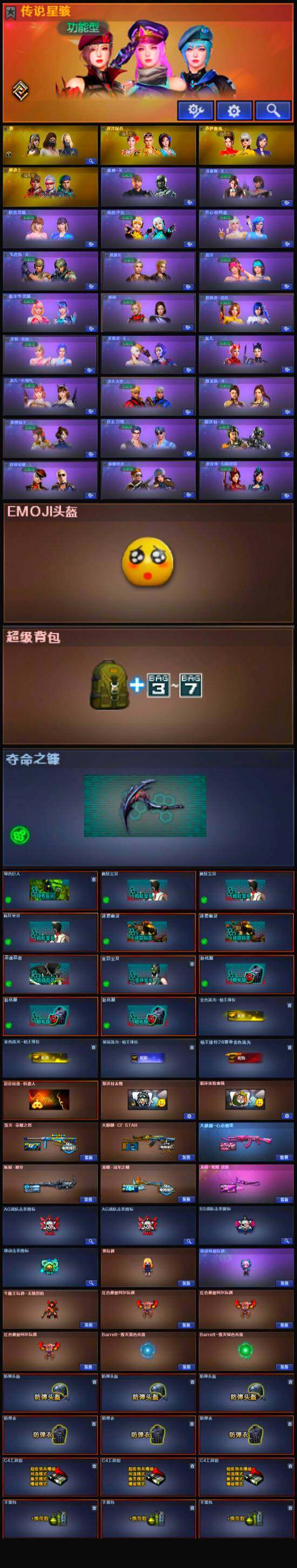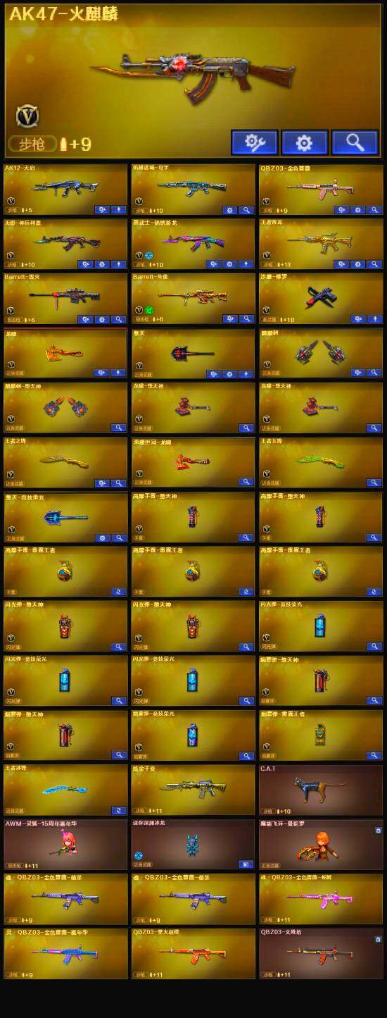 【英雄级武器】:擎天-竞技荣光,烟雾弹-竞技荣光,闪光弹-竞技荣光*3,麒麟刺-堕天神,龙啸-堕天神*2,荣耀世冠-龙啸,QBZ03-金色蔷薇,无影-神兵利器,AK47-火麒麟,AK12-天启,Barrett-毁灭,Barrett-朱雀,黑武士-锦绣游龙,M4A1-赤狱骑士,沙鹰-修罗,麒麟刺,擎天,龙啸