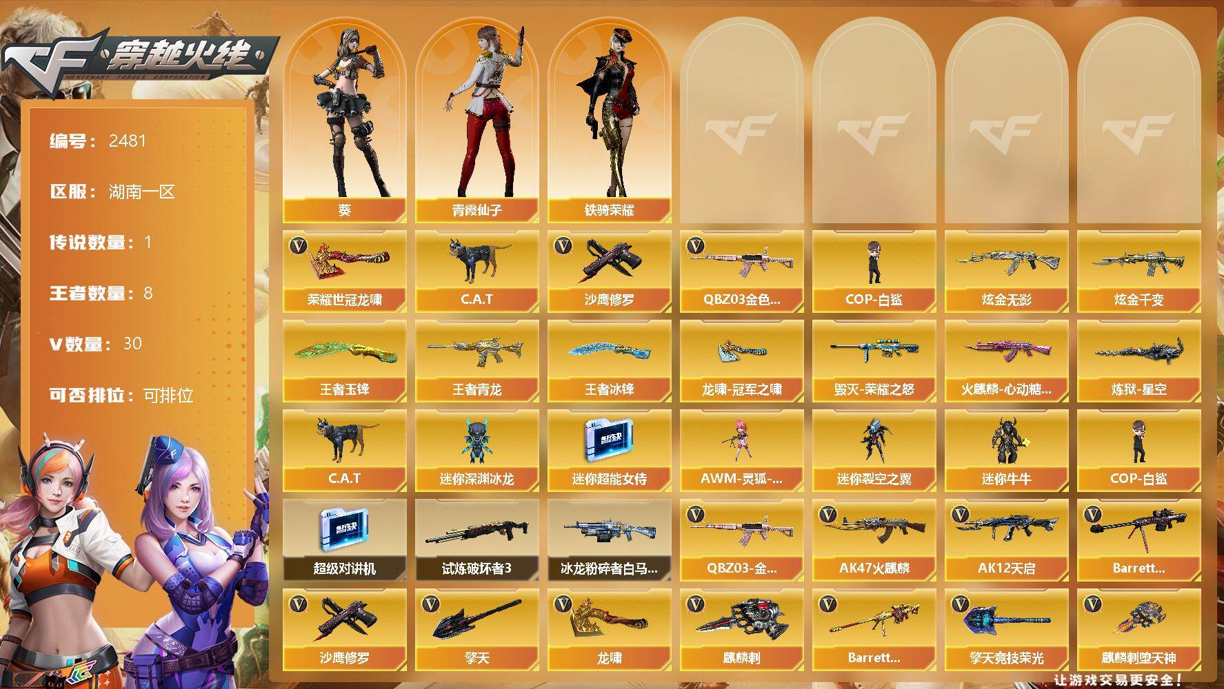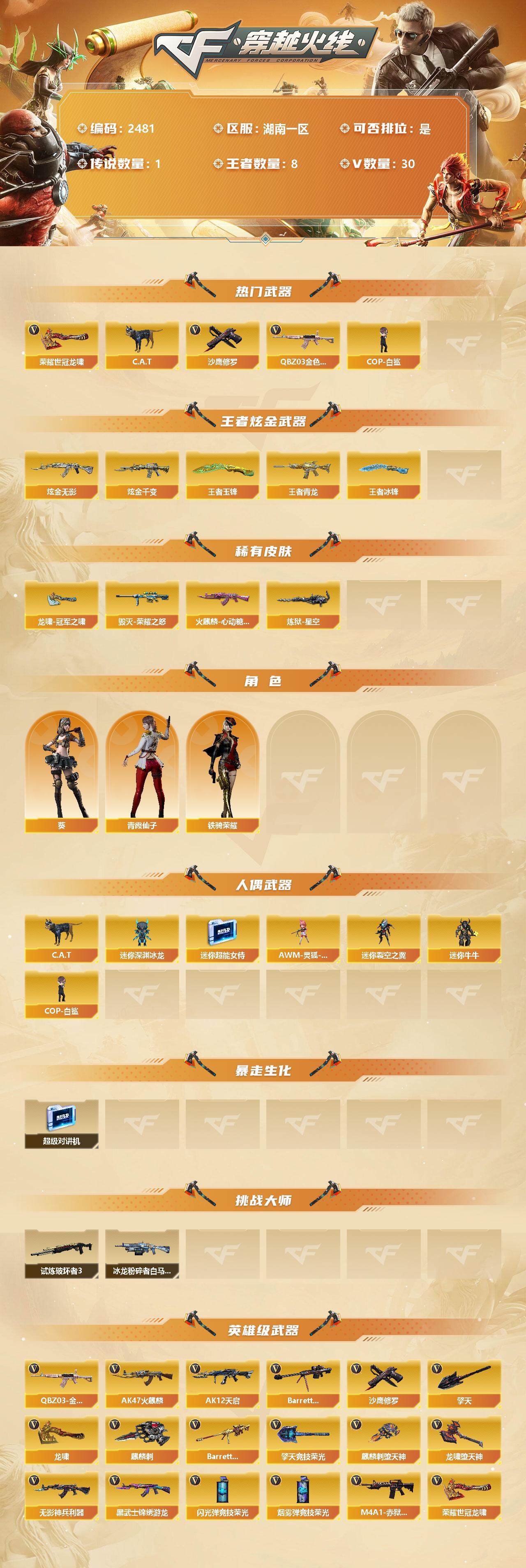 [12118721]【商品标题】:湖南一区-30V-8王者-2炫金 【传说角色】:传说星骇 【热门武器】:QBZ03-金色蔷薇,C.A.T,COP-白鲨,沙鹰-修罗,荣耀世冠-龙啸 【王者炫金武器】:炫金无影,炫金千变,王者青龙,王者玉锋,王者冰锋 【稀有皮肤】:火麒麟-心动糖果,炼狱-星空,毁灭-荣耀之怒,龙啸-冠军之啸 【角色】:葵,铁骑荣耀,青霞仙子 【人偶武器】:COP-白鲨,AWM-灵狐-15周年嘉年华,C.A.T,迷你深渊冰龙,迷你超能女侍,迷你裂空之翼,迷你牛牛 【暴走生化】:超级对讲机 【挑战大师】:试炼破坏者III,冰龙粉碎者-白马银枪*2 【英雄级武器】:擎天-竞技荣光,烟雾弹-竞技荣光,闪光弹-竞技荣光*3,麒麟刺-堕天神,龙啸-堕天神*2,荣耀世冠-龙啸,QBZ03-金色蔷薇,无影-神兵利器,AK47-火麒麟,AK12-天启,Barrett-毁灭,Barrett-朱雀,黑武士-锦绣游龙,M4A1-赤狱骑士,沙鹰-修罗,麒麟刺,擎天,龙啸 【特殊枪械】: