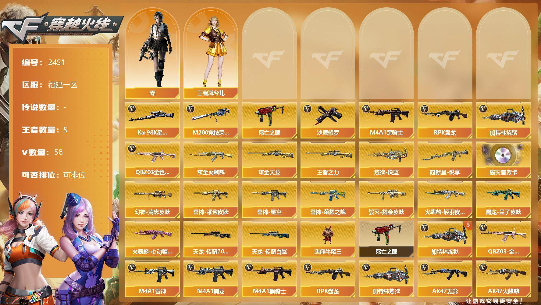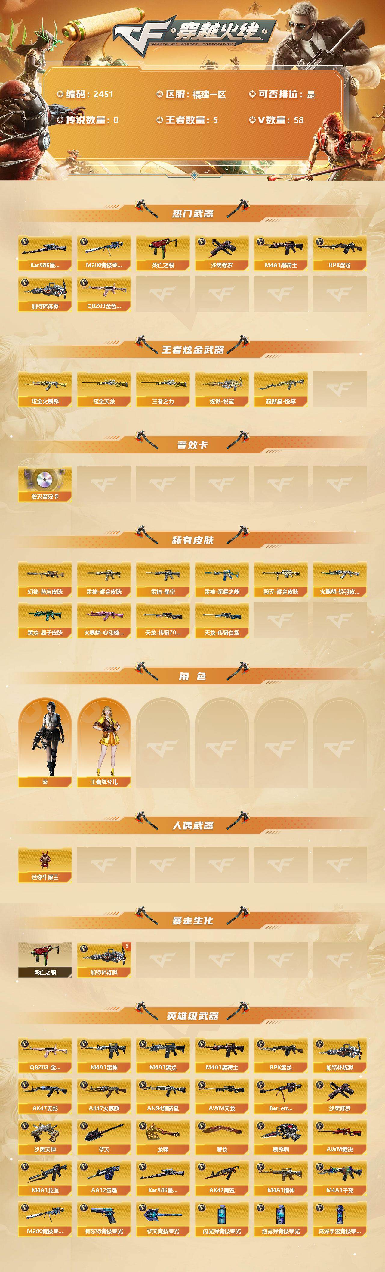 [12120155]【商品标题】:福建一区-58V-5王者-2炫金 【热门武器】:QBZ03-金色蔷薇,M200-竞技荣光,死亡之眼,Kar98K-星神,M4A1-黑骑士,RPK-盘龙,加特林-炼狱*5,沙鹰-修罗*2 【王者炫金武器】:炫金火麒麟,炫金天龙,炼狱-悦蓝,超新星-悦享,王者之力 【音效卡】:Barrett-毁灭音效卡 【稀有皮肤】:M200-幻神-黄忠皮肤,雷神-荣耀之魄,雷神-星空,雷神-耀金皮肤,火麒麟-轻羽皮肤,火麒麟-心动糖果,黑龙-墨子皮肤,毁灭耀金皮肤,AWM-天龙-传奇70KG,AWM-天龙-传奇白鲨 【角色】:王者岚兮儿,零 【人偶武器】:迷你牛魔王 【暴走生化】:死亡之眼 【英雄级武器】:M200-竞技荣光,柯尔特-竞技荣光,擎天-竞技荣光,高爆手雷-竞技荣光,烟雾弹-竞技荣光,闪光弹-竞技荣光,QBZ03-金色蔷薇,M4A1-雷神,M4A1-黑龙,M4A1-黑骑士,RPK-盘龙,加特林-炼狱*5,AK47-无影*2,AK47-火麒麟*2,AN94-超新星*2,AWM-天龙*2,Barrett-毁灭,AWM-裁决,M4A1-龙血*2,AA-12-雷霆,Kar98K-星神,AK47-黑鲨*2,M4A1-猎神,M4A1-千变,沙鹰-天神,沙鹰-修罗*2,麒麟刺,擎天*2,龙啸*8,屠龙*3 【特殊枪械】:1黑骑士,1盘龙,5炼狱