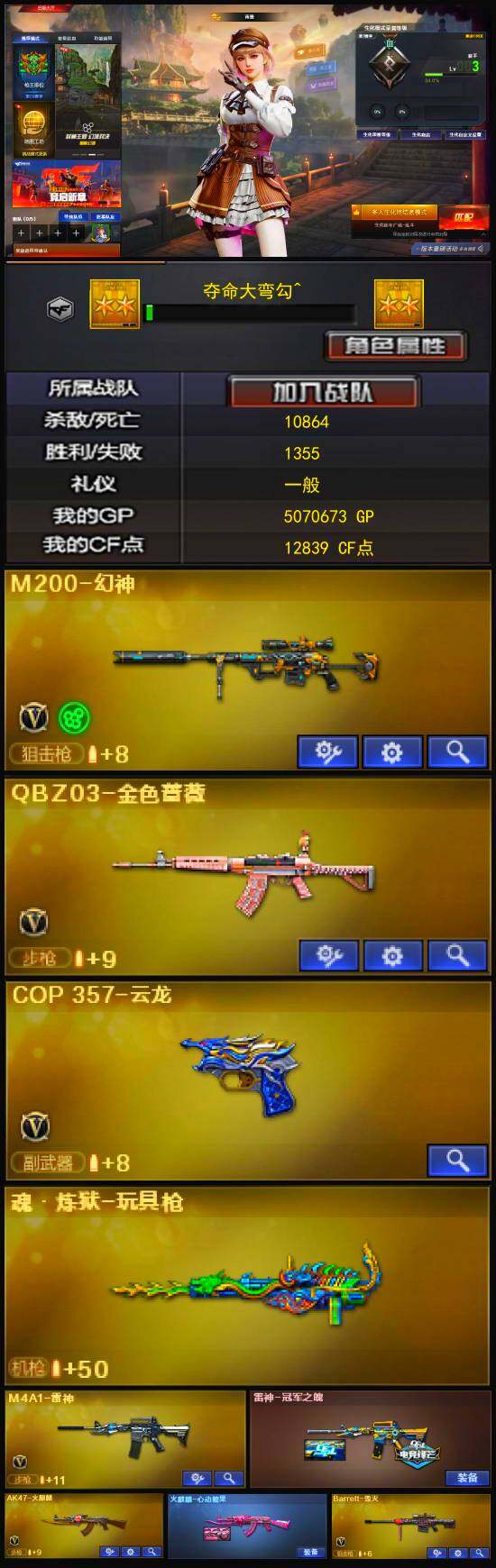 【英雄级武器】:COP 357-云龙,QBZ03-金色蔷薇,无影-神兵利器,M4A1-雷神,AK47-火麒麟,Barrett-毁灭,M200-幻神,VSK-94-金蚀,黑武士-锦绣游龙