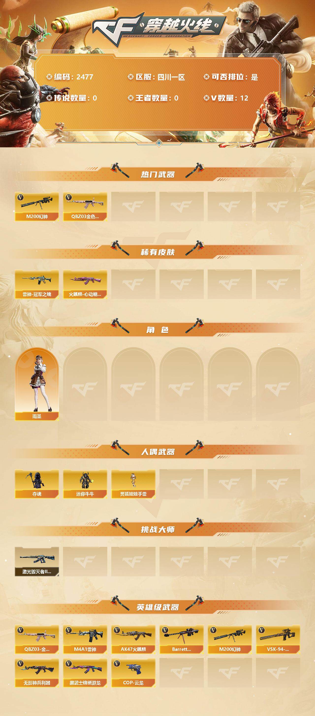 [12118974]【商品标题】:四川一区-12V-0王者-0炫金 【热门武器】:QBZ03-金色蔷薇,M200-幻神 【稀有皮肤】:雷神-冠军之魄,火麒麟-心动糖果 【角色】:雨墨 【人偶武器】:夺魂,迷你牛牛,灵狐娃娃手雷 【挑战大师】:激光毁灭者III-白马银枪 【英雄级武器】:COP 357-云龙,QBZ03-金色蔷薇,无影-神兵利器,M4A1-雷神,AK47-火麒麟,Barrett-毁灭,M200-幻神,VSK-94-金蚀,黑武士-锦绣游龙 【特殊枪械】: