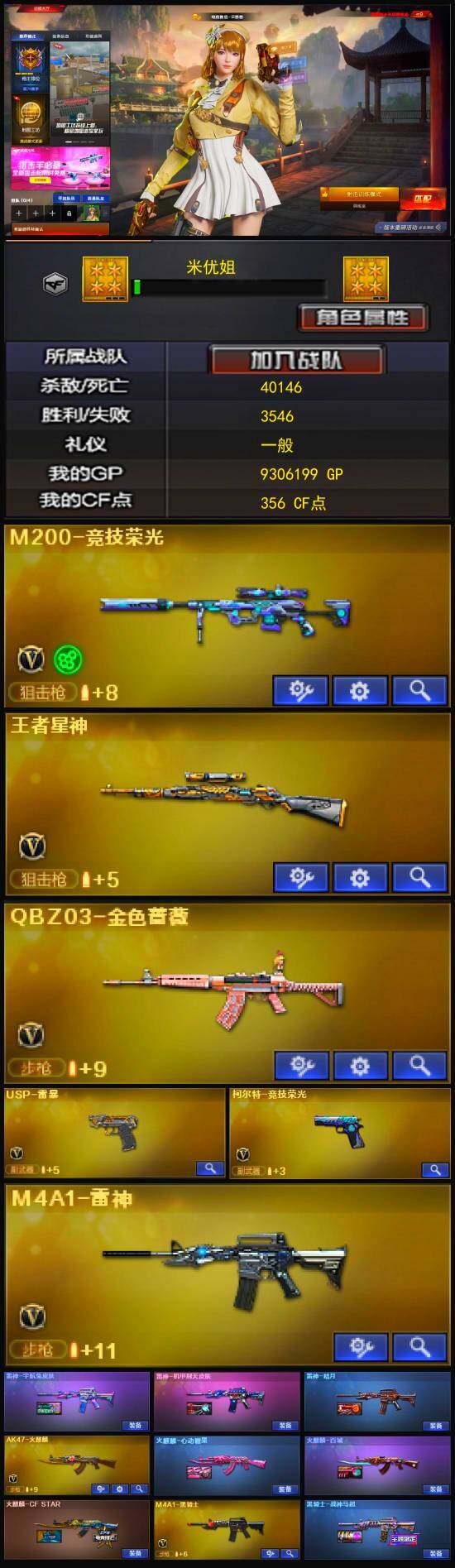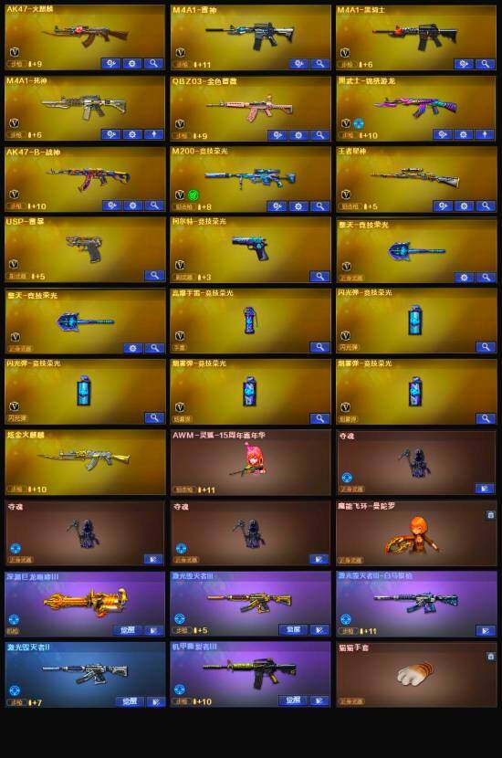 【英雄级武器】:M200-竞技荣光,柯尔特-竞技荣光,擎天-竞技荣光*2,高爆手雷-竞技荣光,烟雾弹-竞技荣光*2,闪光弹-竞技荣光*2,USP-雷暴,QBZ03-金色蔷薇,M4A1-雷神,M4A1-黑骑士,M4A1-死神,AK47-火麒麟,黑武士-锦绣游龙,AK47-B-战神