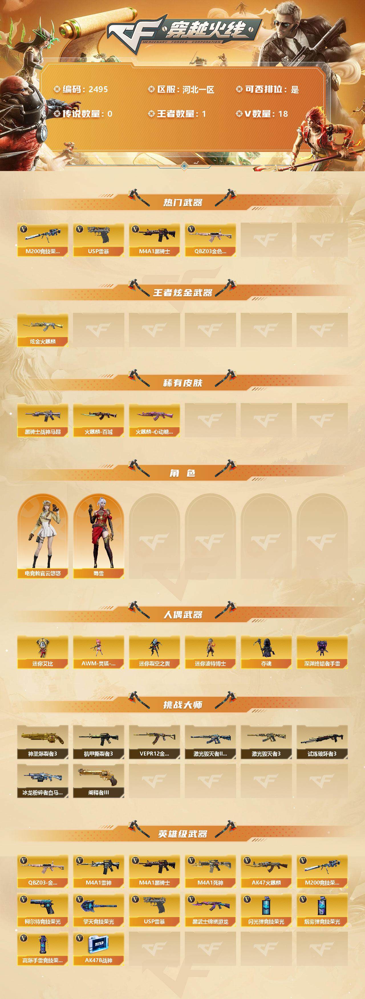 [12152607]【商品标题】:河北一区-18V-1王者-1炫金 【热门武器】:QBZ03-金色蔷薇,M200-竞技荣光,M4A1-黑骑士,USP-雷暴 【王者炫金武器】:炫金火麒麟 【稀有皮肤】:火麒麟-百城,火麒麟-心动糖果,黑骑士-战神马超 【角色】:电竞教官-云悠悠,蜀雪 【人偶武器】:AWM-灵狐-15周年嘉年华,迷你艾比,迷你裂空之翼*2,迷你波特博士,夺魂*3,深渊终结者手雷*3 【挑战大师】:神圣爆裂者III,机甲撕裂者III,阐释者III,试炼破坏者III,激光毁灭者III,VEPR-12-金魔,激光毁灭者III-白马银枪,冰龙粉碎者-白马银枪 【英雄级武器】:M200-竞技荣光,柯尔特-竞技荣光,擎天-竞技荣光*2,高爆手雷-竞技荣光,烟雾弹-竞技荣光*2,闪光弹-竞技荣光*2,USP-雷暴,QBZ03-金色蔷薇,M4A1-雷神,M4A1-黑骑士,M4A1-死神,AK47-火麒麟,黑武士-锦绣游龙,AK47-B-战神 【特殊枪械】:1黑骑士