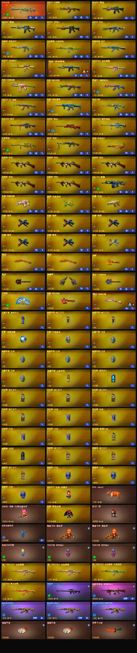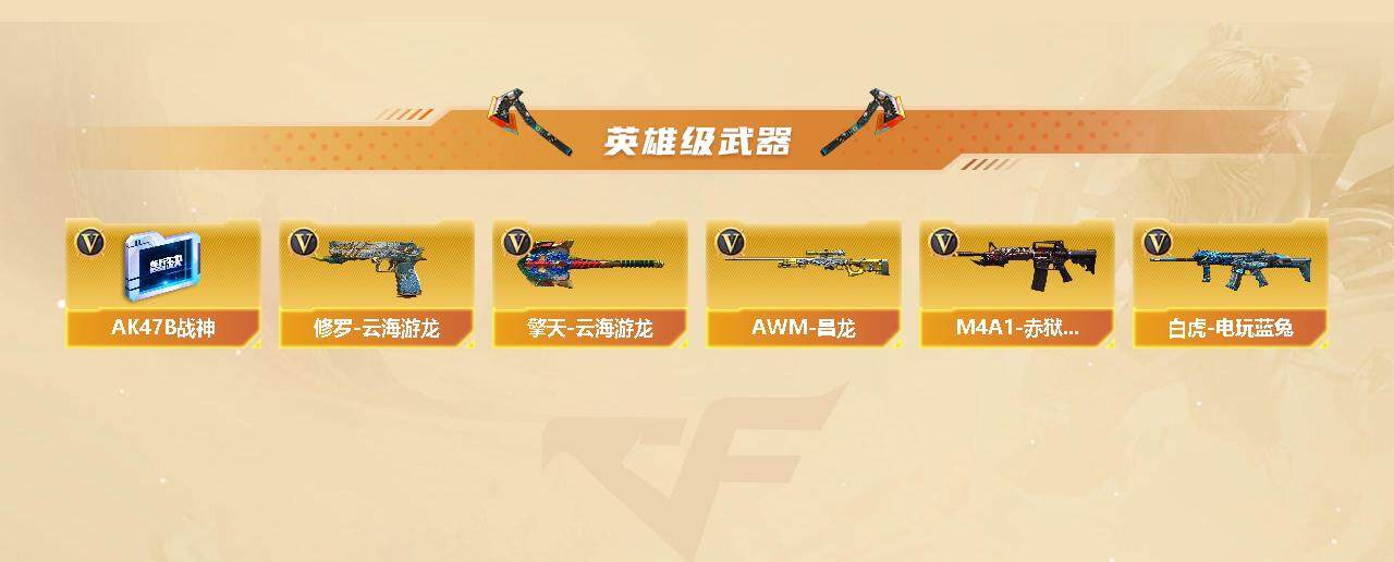 【英雄级武器】:高爆手雷-竞技荣光,闪光弹-竞技荣光,烈火-动感闪耀,天神-动感闪耀,屠龙-动感闪耀,手雷-动感闪耀,QBZ03-金色蔷薇,金色蔷薇-古蛇迷踪,白虎-电玩蓝兔,无影-神兵利器,M4A1-雷神,M4A1-黑龙,M4A1-玫瑰精灵,M4A1-黑骑士,RPK-盘龙,汤姆逊-烈龙*5,AK47-火麒麟,AK12-天启,Barrett-毁灭,AWM-裁决,AA-12-雷霆,黑武士-锦绣游龙,超新星-热带奇洋,死神-雪域霜狐,AK47-B-战神,AWM-昌龙,M4A1-赤狱骑士,修罗-古蛇迷踪,沙鹰-天神,沙鹰-修罗*5,修罗-云海游龙,麒麟刺,擎天,龙啸,屠龙*2,擎天-云海游龙