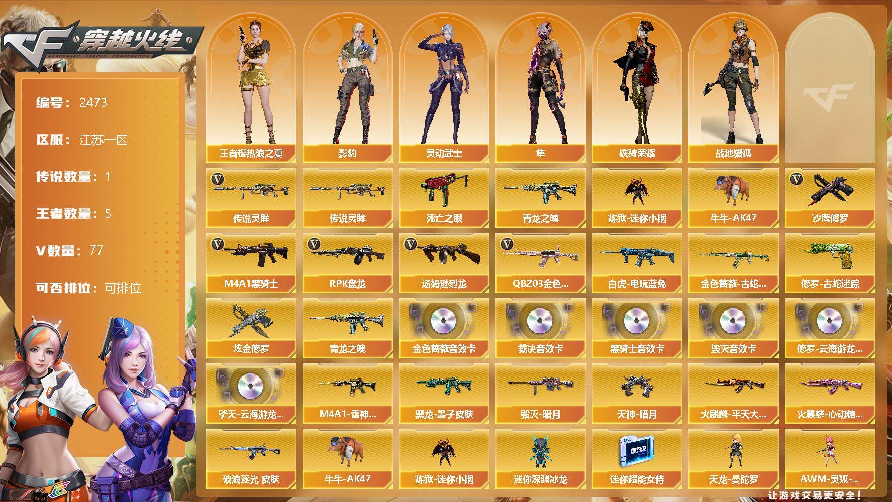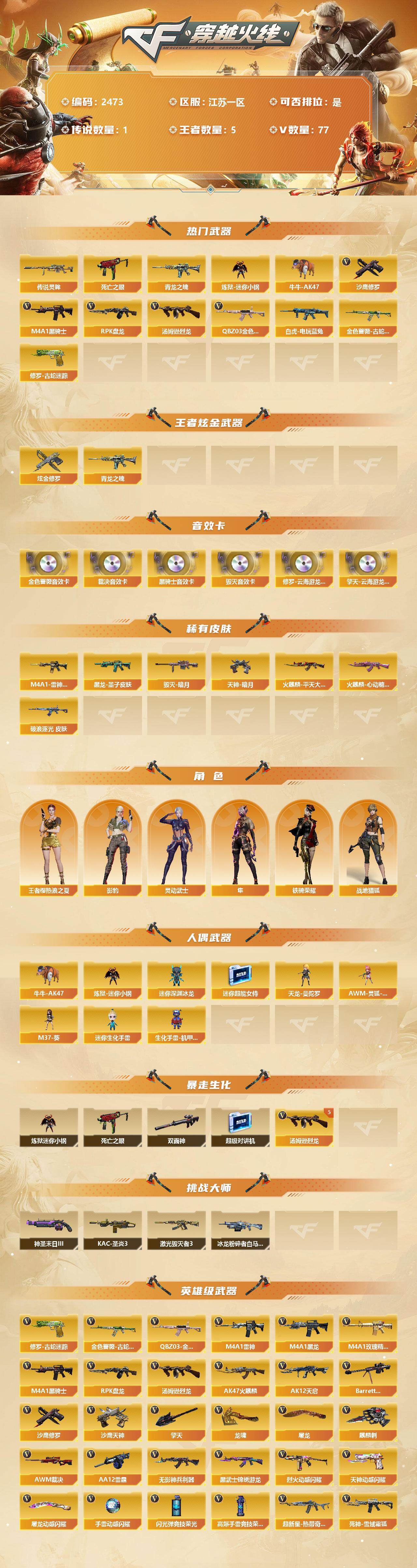[12119134]【商品标题】:江苏一区-77V-5王者-1炫金 【传说武器】:传说灵眸 【热门武器】:传说灵眸,QBZ03-金色蔷薇,金色蔷薇-古蛇迷踪,修罗-古蛇迷踪,死亡之眼,青龙之魄,白虎-电玩蓝兔,炼狱-迷你小钢,牛牛-AK47,M4A1-黑骑士,汤姆逊-烈龙*5,RPK-盘龙,沙鹰-修罗*5 【王者炫金武器】:炫金修罗,青龙之魄 【音效卡】:修罗-云海游龙音效卡,擎天-云海游龙音效卡,M4A1-黑骑士音效卡,Barrett-毁灭音效卡,QBZ03-金色蔷薇音效卡,AWM-裁决音效卡 【稀有皮肤】:金色蔷薇-破浪逐光 皮肤,M4A1-雷神-CFS 2019,火麒麟-平天大圣,火麒麟-心动糖果,黑龙-墨子皮肤,毁灭-暗月,天神-暗月 【角色】:王者樱-热浪之夏,影豹,隼,战地猎狐,铁骑荣耀,灵动武士 【人偶武器】:天龙-曼陀罗,AWM-灵狐-15周年嘉年华,M37-葵,牛牛-AK47,炼狱-迷你小钢,迷你深渊冰龙,迷你超能女侍,迷你生化手雷,生化手雷-机甲核心*2 【暴走生化】:炼狱-迷你小钢,死亡之眼,双面神,超级对讲机 【挑战大师】:神圣爆裂者-末日III*2,KAC-圣炎切割者III,激光毁灭者III*2,冰龙粉碎者-白马银枪 【英雄级武器】:高爆手雷-竞技荣光,闪光弹-竞技荣光,烈火-动感闪耀,天神-动感闪耀,屠龙-动感闪耀,手雷-动感闪耀,QBZ03-金色蔷薇,金色蔷薇-古蛇迷踪,白虎-电玩蓝兔,无影-神兵利器,M4A1-雷神,M4A1-黑龙,M4A1-玫瑰精灵,M4A1-黑骑士,RPK-盘龙,汤姆逊-烈龙*5,AK47-火麒麟,AK12-天启,Barrett-毁灭,AWM-裁决,AA-12-雷霆,黑武士-锦绣游龙,超新星-热带奇洋,死神-雪域霜狐,AK47-B-战神,AWM-昌龙,M4A1-赤狱骑士,修罗-古蛇迷踪,沙鹰-天神,沙鹰-修罗*5,修罗-云海游龙,麒麟刺,擎天,龙啸,屠龙*2,擎天-云海游龙 【特殊枪械】:1黑骑士,5烈龙,1盘龙