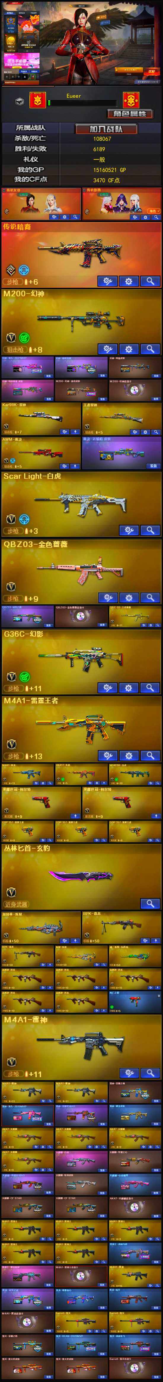 【热门武器】:传说暗裔,G36C-幻影,QBZ03-金色蔷薇,M14EBR-玄武,Scar Light-白虎,HK417-朱雀,M4A1-青龙,M200-幻神,死亡之眼,荣耀世冠-火麒麟,荣耀世冠-雷神*2,荣耀世冠-柯尔特*2,Kar98K-星神,M4A1-黑骑士*5,汤姆逊-烈龙*5,RPK-盘龙*2,加特林-炼狱,沙鹰-修罗,荣耀世冠-龙啸