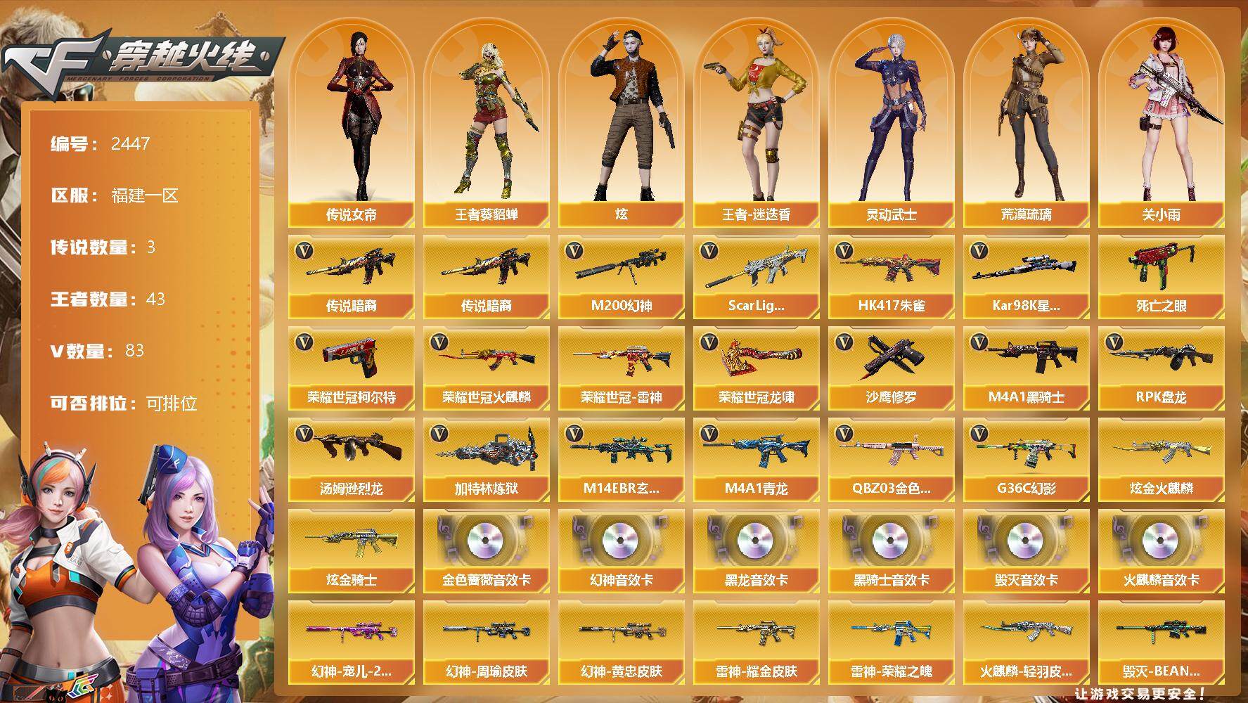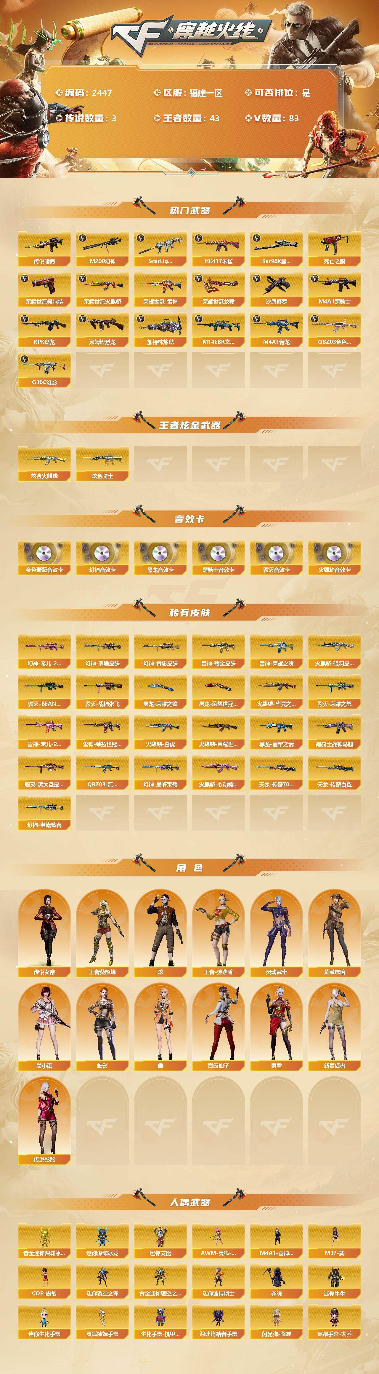 [12120508]【商品标题】:福建一区-83V-43王者-2炫金 【传说武器】:传说暗裔 【传说角色】:传说女帝,传说影煞 【热门武器】:传说暗裔,G36C-幻影,QBZ03-金色蔷薇,M14EBR-玄武,Scar Light-白虎,HK417-朱雀,M4A1-青龙,M200-幻神,死亡之眼,荣耀世冠-火麒麟,荣耀世冠-雷神*2,荣耀世冠-柯尔特*2,Kar98K-星神,M4A1-黑骑士*5,汤姆逊-烈龙*5,RPK-盘龙*2,加特林-炼狱,沙鹰-修罗,荣耀世冠-龙啸 【王者炫金武器】:炫金火麒麟,炫金骑士 【音效卡】:M200-幻神音效卡,AK47-火麒麟音效卡,M4A1-黑龙音效卡,M4A1-黑骑士音效卡,Barrett-毁灭音效卡,QBZ03-金色蔷薇音效卡 【稀有皮肤】:M200-幻神-黄忠皮肤,幻神-周瑜皮肤,幻神-宠儿-2021MVP,幻神-巅峰荣耀,幻神-电流骇客 皮肤,QBZ03-冠军之薇,雷神-荣耀之魄,雷神-耀金皮肤,雷神-宠儿-2019MVP,雷神-荣耀世冠AG,火麒麟-华夏之心,火麒麟-轻羽皮肤,火麒麟-白虎,火麒麟-荣耀世冠AG,火麒麟-心动糖果,黑骑士-战神马超,黑龙-冠军之武,毁灭-荣耀之怒,毁灭-战神张飞,毁灭-BEAN-2020MVP,毁灭-黑大圣皮肤*2,AWM-天龙-传奇70KG,AWM-天龙-传奇白鲨,屠龙-荣耀之锋,屠龙-荣耀世冠AG 【角色】:传说女帝,传说影煞,王者-葵-貂蝉,王者-迷迭香,魅影,炫,幽,荒漠琉璃,关小雨,蜀雪,新灵狐者,灵动武士,青霞仙子 【人偶武器】:AWM-灵狐-15周年嘉年华,M4A1-雷神-精英刀锋,M37-葵,COP-旗袍,黄金迷你深渊冰龙*2,迷你深渊冰龙,迷你艾比,迷你裂空之翼*4,黄金迷你裂空之翼,迷你波特博士,夺魂,迷你牛牛,迷你生化手雷,灵狐娃娃手雷,生化手雷-机甲核心,深渊终结者手雷*2,闪光弹-貂蝉,高爆手雷-大乔 【暴走生化】:死亡之眼,双面神,超级对讲机 【挑战大师】:试炼破坏者III,激光毁灭者III*4,AK47-冰龙粉碎者,冰龙粉碎者-白马银枪,致命乱世-超越Max 【英雄级武器】:高爆手雷-竞技荣光*2,烟雾弹-竞技荣光*2,闪光弹-竞技荣光*2,荣耀世冠-火麒麟,荣耀世冠-雷神*2,荣耀世冠-柯尔特*2,荣耀世冠-龙啸,G36C-幻影,QBZ03-金色蔷薇,M14EBR-玄武,S