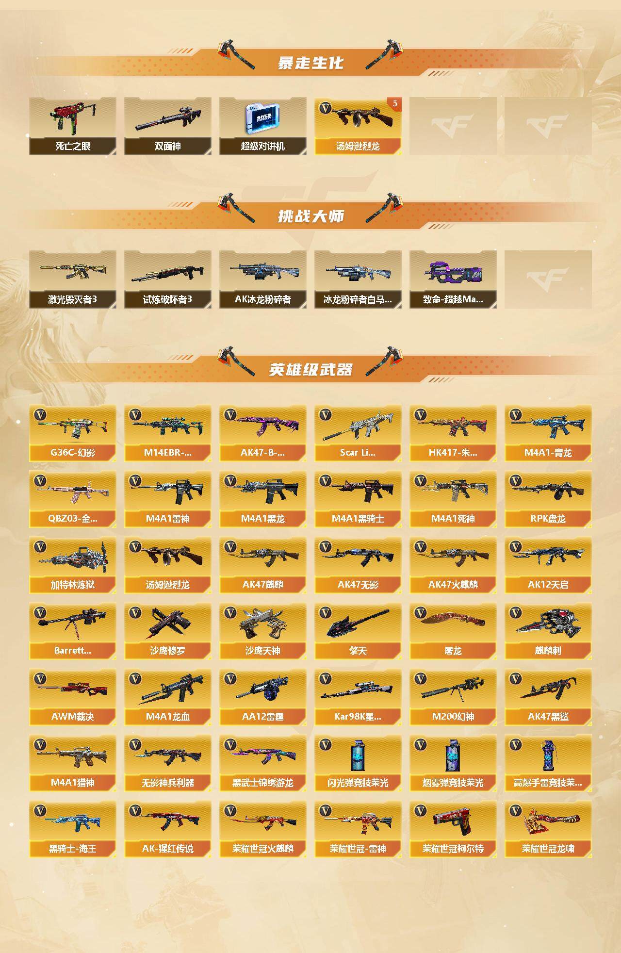【英雄级武器】:高爆手雷-竞技荣光*2,烟雾弹-竞技荣光*2,闪光弹-竞技荣光*2,荣耀世冠-火麒麟,荣耀世冠-雷神*2,荣耀世冠-柯尔特*2,荣耀世冠-龙啸,G36C-幻影,QBZ03-金色蔷薇,M14EBR-玄武,S