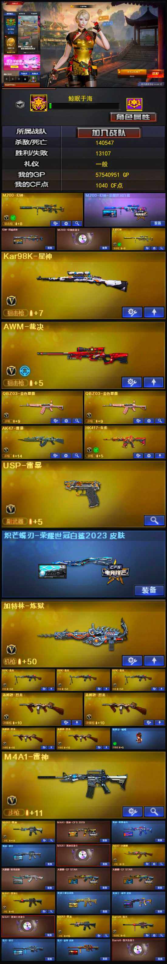 【热门武器】:QBZ03-金色蔷薇*2,HK417-朱雀,M200-幻神,金色蔷薇-古蛇迷踪,修罗-古蛇迷踪,Kar98K-星神,M4A1-黑骑士,汤姆逊-烈龙*4,RPK-盘龙*3,加特林-炼狱,斯泰尔-蝴蝶,降世魔童,COP-白鲨,USP-雷暴,沙鹰-修罗,炽芒蝶刃-荣耀世冠白鲨2023 皮肤