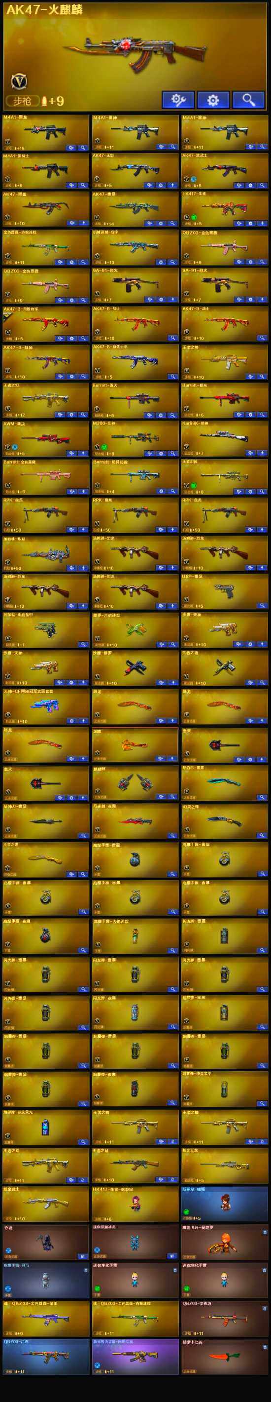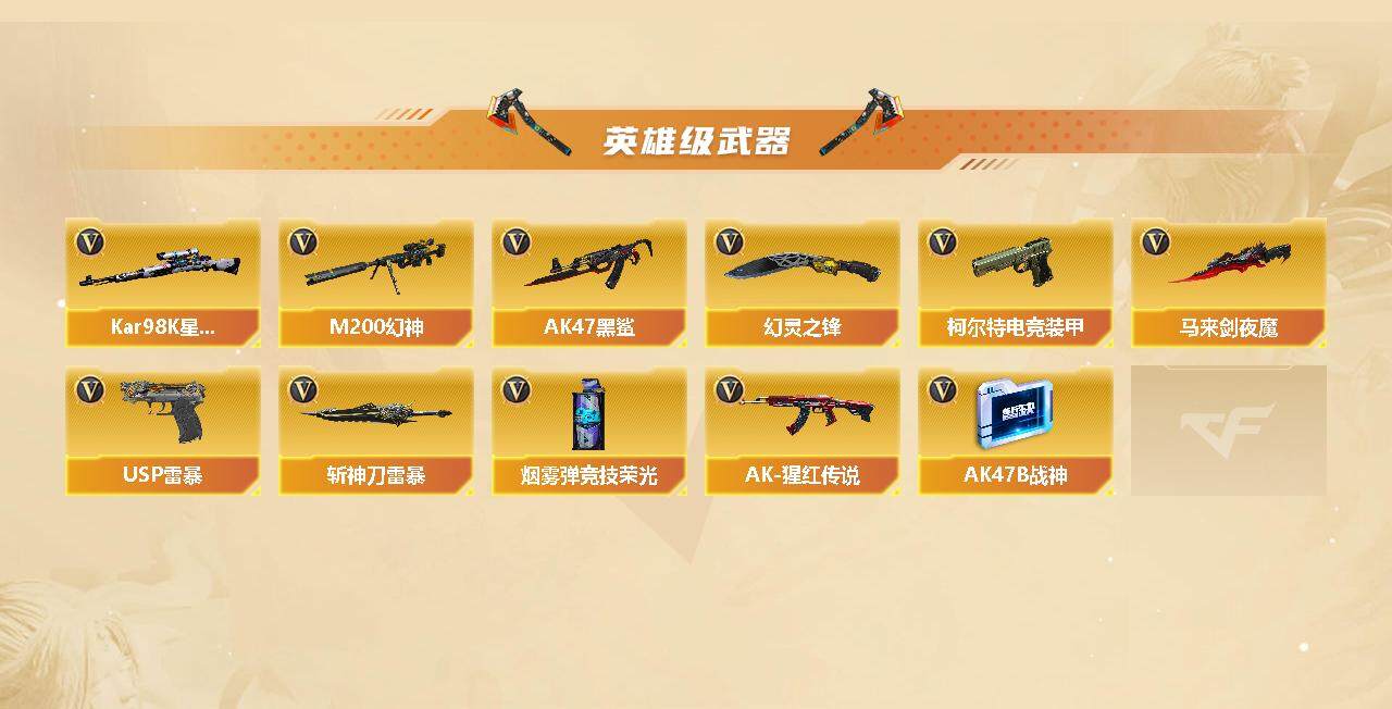 【英雄级武器】:烟雾弹-竞技荣光,幻灵之锋,柯尔特-电竞装甲,马来剑-夜魔,AK47-雷暴,USP-雷暴,斩神刀-雷暴,QBZ03-金色蔷薇*2,HK417-朱雀,金色蔷薇-古蛇迷踪,M4A1-雷神*2,M4A1-黑龙,M4A1-黑骑士,RPK-盘龙*3,加特林-炼狱,汤姆逊-烈龙*4,AK47-无影,AK47-火麒麟,AK47-黑武士,Barrett-毁灭,Barrett-极光,AWM-裁决,Kar98K-星神,M200-幻神,AK47-黑鲨,AK-47-猩红传说*2,AK47-B-战神,AK47-B-常胜将军,修罗-古蛇迷踪,沙鹰-天神*2,沙鹰-修罗,麒麟刺,擎天*2,龙啸,屠龙*3