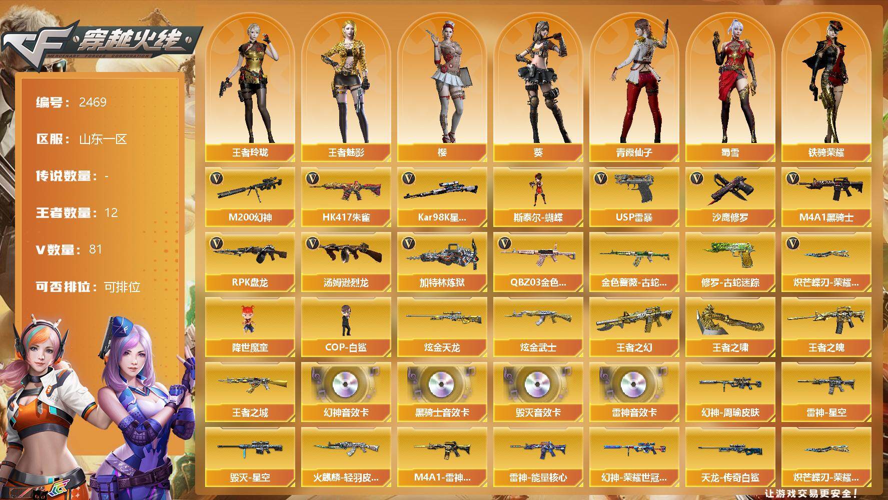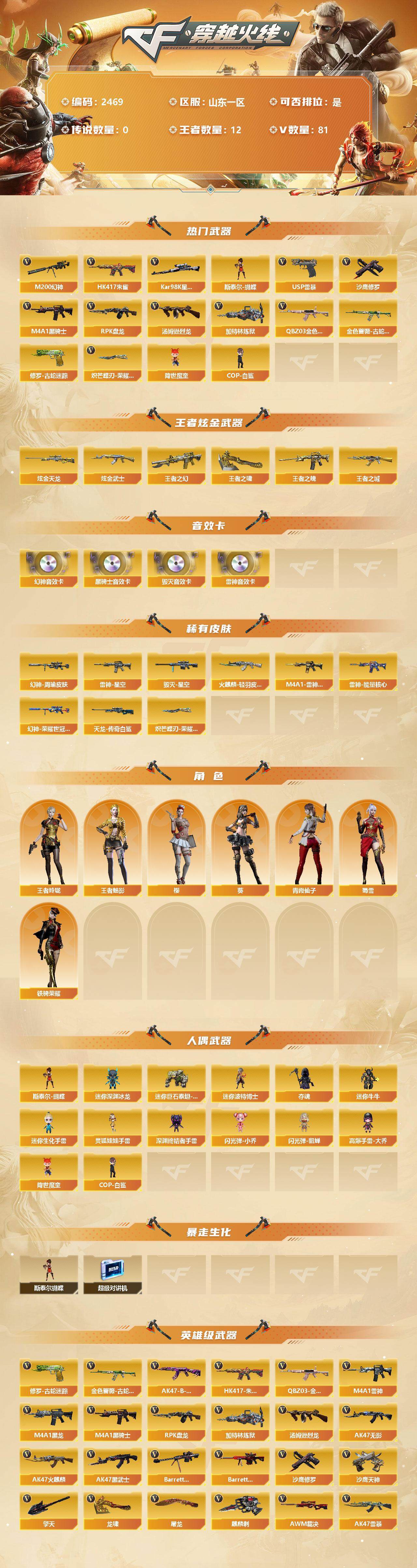[12119224]【商品标题】:山东一区-81V-12王者-2炫金 【热门武器】:QBZ03-金色蔷薇*2,HK417-朱雀,M200-幻神,金色蔷薇-古蛇迷踪,修罗-古蛇迷踪,Kar98K-星神,M4A1-黑骑士,汤姆逊-烈龙*4,RPK-盘龙*3,加特林-炼狱,斯泰尔-蝴蝶,降世魔童,COP-白鲨,USP-雷暴,沙鹰-修罗,炽芒蝶刃-荣耀世冠白鲨2023 皮肤 【王者炫金武器】:炫金天龙,炫金武士,王者之城,王者之幻,王者之魄*2,王者之啸 【音效卡】:M200-幻神音效卡,M4A1-雷神音效卡,M4A1-黑骑士音效卡,Barrett-毁灭音效卡 【稀有皮肤】:幻神-周瑜皮肤,M200-幻神-荣耀世冠白鲨,雷神-能量核心,雷神-星空,M4A1-雷神-CFS 2019,火麒麟-轻羽皮肤,毁灭-星空,AWM-天龙-传奇白鲨,炽芒蝶刃-荣耀世冠白鲨2023 皮肤 【角色】:王者玲珑,王者-魅影,葵,樱,蜀雪,铁骑荣耀,青霞仙子 【人偶武器】:降世魔童,COP-白鲨,斯泰尔-蝴蝶,迷你深渊冰龙,迷你巨石泰坦-魔花研究所,迷你波特博士,夺魂,迷你牛牛,迷你生化手雷*2,灵狐娃娃手雷,深渊终结者手雷,闪光弹-小乔,闪光弹-貂蝉,高爆手雷-大乔 【暴走生化】:斯泰尔-蝴蝶,超级对讲机 【英雄级武器】:烟雾弹-竞技荣光,幻灵之锋,柯尔特-电竞装甲,马来剑-夜魔,AK47-雷暴,USP-雷暴,斩神刀-雷暴,QBZ03-金色蔷薇*2,HK417-朱雀,金色蔷薇-古蛇迷踪,M4A1-雷神*2,M4A1-黑龙,M4A1-黑骑士,RPK-盘龙*3,加特林-炼狱,汤姆逊-烈龙*4,AK47-无影,AK47-火麒麟,AK47-黑武士,Barrett-毁灭,Barrett-极光,AWM-裁决,Kar98K-星神,M200-幻神,AK47-黑鲨,AK-47-猩红传说*2,AK47-B-战神,AK47-B-常胜将军,修罗-古蛇迷踪,沙鹰-天神*2,沙鹰-修罗,麒麟刺,擎天*2,龙啸,屠龙*3 【特殊枪械】:蝴蝶斯泰尔+4烈龙,1黑骑士,4烈龙,3盘龙,1炼狱,1蝴蝶斯泰尔