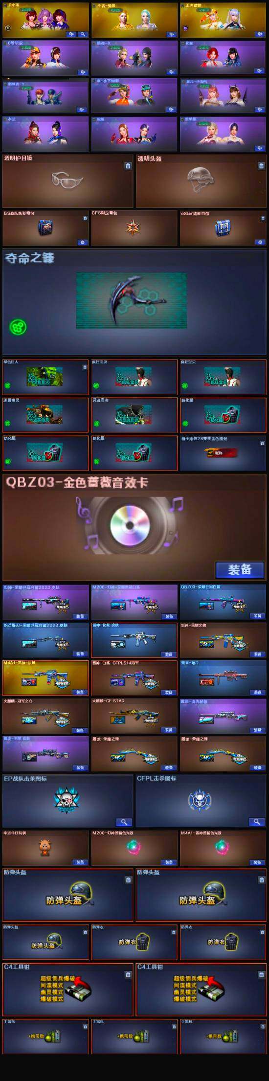 【英雄级武器】:高爆手雷-竞技荣光*2,烟雾弹-竞技荣光,闪光弹-竞技荣光,G36C-幻影,QBZ03-金色蔷薇,M4A1-雷神,汤姆逊-烈龙*2,Barrett-毁灭,AWM-裁决,M200-幻神,柯尔特-冠军之特,沙鹰-天神,炽芒蝶刃,擎天,屠龙*2