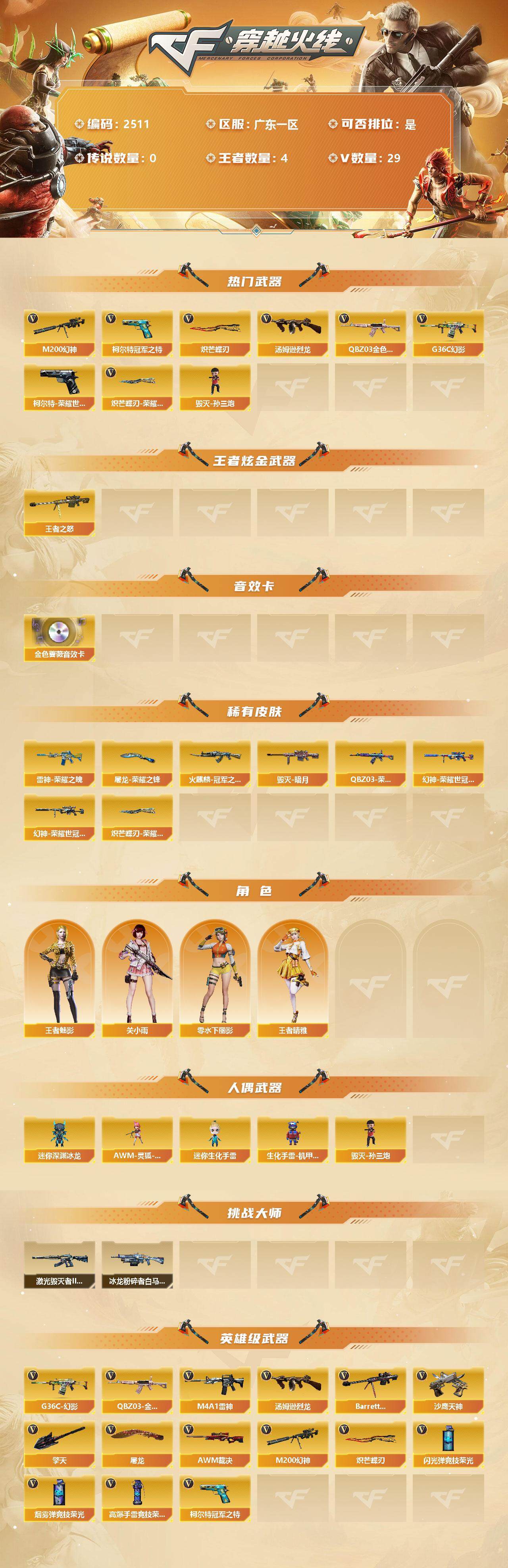 [12153175]【商品标题】:广东一区-29V-4王者-0炫金 【热门武器】:G36C-幻影,QBZ03-金色蔷薇,M200-幻神,柯尔特-荣耀世冠白鲨2023,柯尔特-冠军之特,汤姆逊-烈龙*2,毁灭-孙三炮,炽芒蝶刃,炽芒蝶刃-荣耀世冠白鲨2023 皮肤 【王者炫金武器】:王者之怒 【音效卡】:QBZ03-金色蔷薇音效卡 【稀有皮肤】:M200-幻神-荣耀世冠白鲨,幻神-荣耀世冠白鲨2023 皮肤,QBZ03-荣耀世冠白鲨,雷神-荣耀之魄,火麒麟-冠军之心,毁灭-暗月,炽芒蝶刃-荣耀世冠白鲨2023 皮肤,屠龙-荣耀之锋*2 【角色】:王者-魅影,王者晴雅,零-水下丽影,关小雨 【人偶武器】:毁灭-孙三炮,AWM-灵狐-15周年嘉年华,迷你深渊冰龙,迷你生化手雷,生化手雷-机甲核心 【挑战大师】:激光毁灭者III-白马银枪,冰龙粉碎者-白马银枪 【英雄级武器】:高爆手雷-竞技荣光*2,烟雾弹-竞技荣光,闪光弹-竞技荣光,G36C-幻影,QBZ03-金色蔷薇,M4A1-雷神,汤姆逊-烈龙*2,Barrett-毁灭,AWM-裁决,M200-幻神,柯尔特-冠军之特,沙鹰-天神,炽芒蝶刃,擎天,屠龙*2 【特殊枪械】:2烈龙