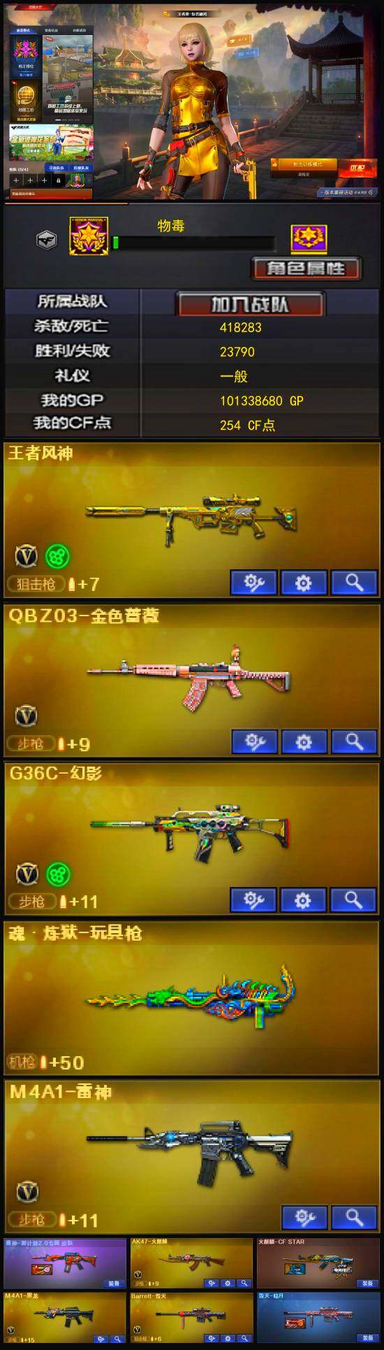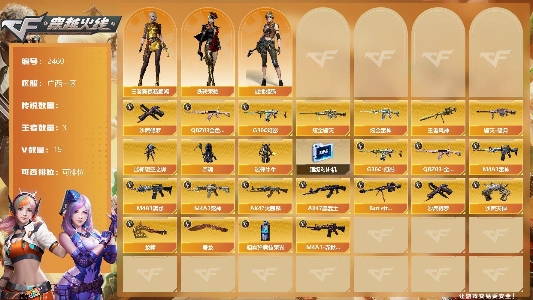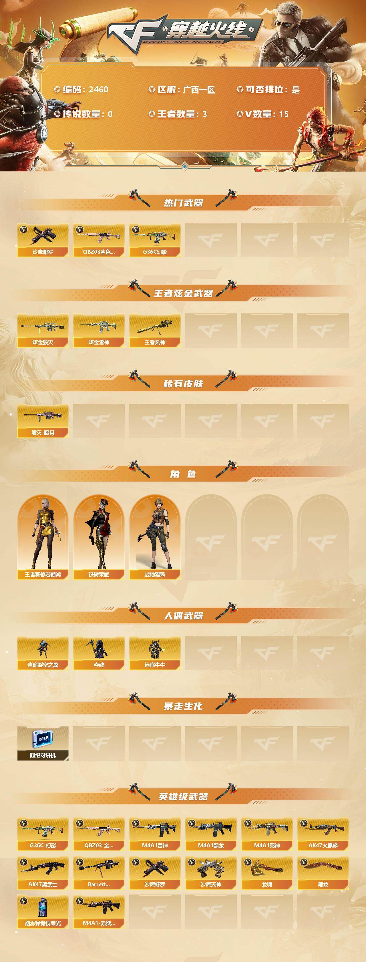 [12119533]【商品标题】:广西一区-15V-3王者-2炫金 【热门武器】:G36C-幻影,QBZ03-金色蔷薇,沙鹰-修罗 【王者炫金武器】:炫金毁灭,炫金雷神,王者风神 【稀有皮肤】:毁灭-暗月 【角色】:王者葵-惊若翩鸿,战地猎狐,铁骑荣耀 【人偶武器】:迷你裂空之翼,夺魂,迷你牛牛*3 【暴走生化】:超级对讲机 【英雄级武器】:烟雾弹-竞技荣光,G36C-幻影,QBZ03-金色蔷薇,M4A1-雷神,M4A1-黑龙,M4A1-死神,AK47-火麒麟,AK47-黑武士,Barrett-毁灭,M4A1-赤狱骑士,沙鹰-天神,沙鹰-修罗,龙啸,屠龙 【特殊枪械】: