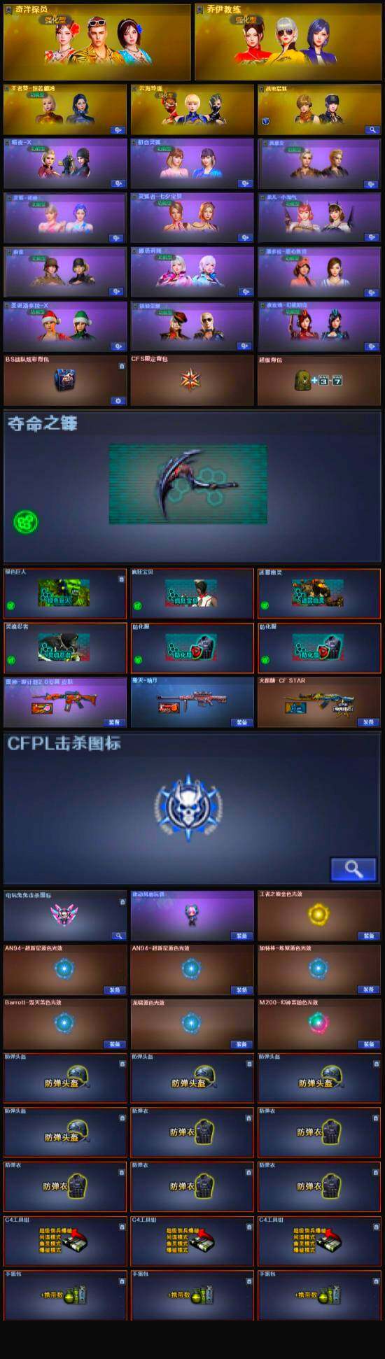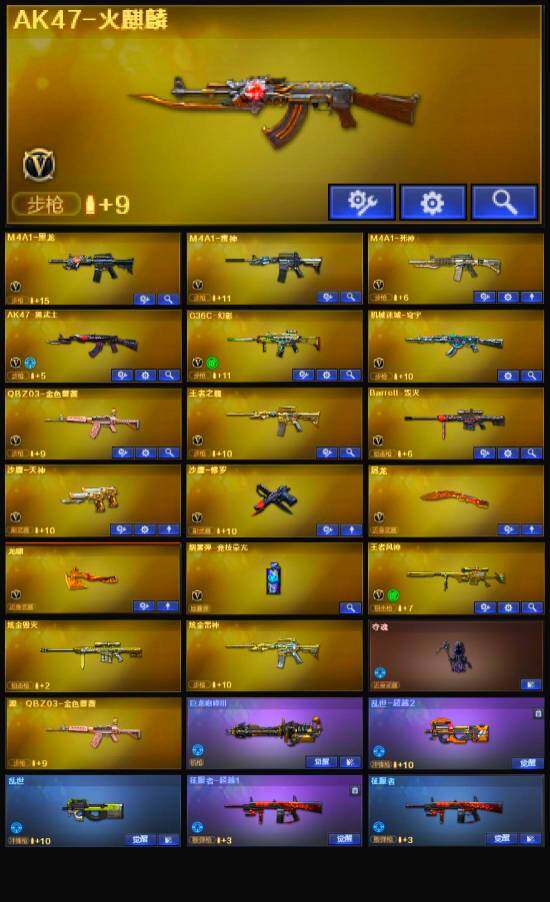 【英雄级武器】:烟雾弹-竞技荣光,G36C-幻影,QBZ03-金色蔷薇,M4A1-雷神,M4A1-黑龙,M4A1-死神,AK47-火麒麟,AK47-黑武士,Barrett-毁灭,M4A1-赤狱骑士,沙鹰-天神,沙鹰-修罗,龙啸,屠龙