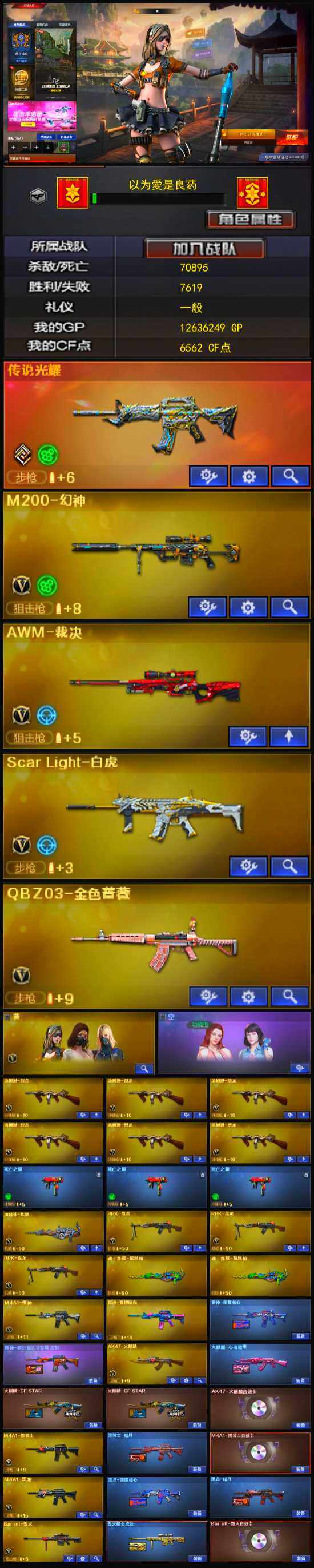 【热门武器】:传说光耀,QBZ03-金色蔷薇,Scar Light-白虎,M200-幻神,死亡之眼*3,金色小号,M4A1-黑骑士,汤姆逊-烈龙*6,RPK-盘龙*3,加特林-炼狱,沙鹰-修罗*5