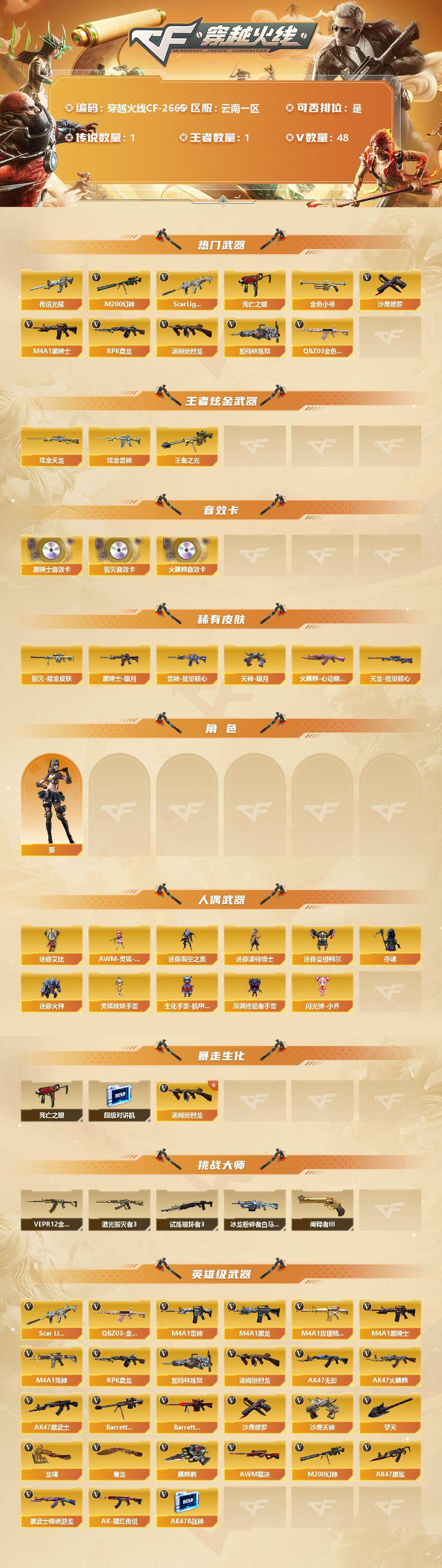 [12130928]【商品标题】:云南一区-48V-1王者-2炫金 【传说武器】:传说光耀 【热门武器】:传说光耀,QBZ03-金色蔷薇,Scar Light-白虎,M200-幻神,死亡之眼*3,金色小号,M4A1-黑骑士,汤姆逊-烈龙*6,RPK-盘龙*3,加特林-炼狱,沙鹰-修罗*5 【王者炫金武器】:炫金天龙,炫金雷神,王者之光 【音效卡】:AK47-火麒麟音效卡,M4A1-黑骑士音效卡,Barrett-毁灭音效卡 【稀有皮肤】:雷神-能量核心,火麒麟-心动糖果,黑骑士-暗月,毁灭耀金皮肤,天龙-能量核心,天神-暗月 【角色】:葵 【人偶武器】:AWM-灵狐-15周年嘉年华*2,迷你艾比,迷你裂空之翼*2,迷你波特博士,迷你曼提柯尔,夺魂*2,迷你火种,灵狐娃娃手雷,生化手雷-机甲核心,深渊终结者手雷,闪光弹-小乔 【暴走生化】:死亡之眼*3,超级对讲机 【挑战大师】:阐释者III,试炼破坏者III,激光毁灭者III,VEPR-12-金魔,冰龙粉碎者-白马银枪 【英雄级武器】:QBZ03-金色蔷薇,Scar Light-白虎,M4A1-雷神,M4A1-黑龙,M4A1-玫瑰精灵,M4A1-黑骑士,M4A1-死神,RPK-盘龙*3,加特林-炼狱,汤姆逊-烈龙*6,AK47-无影,AK47-火麒麟,AK47-黑武士,Barrett-毁灭,Barrett-极光*2,AWM-裁决,M200-幻神,AK47-黑鲨,黑武士-锦绣游龙,AK-47-猩红传说,AK47-B-战神,沙鹰-天神*2,沙鹰-修罗*5,麒麟刺*2,擎天,龙啸*2,屠龙*2 【特殊枪械】:1白虎,1黑骑士,6烈龙,3盘龙,1炼狱