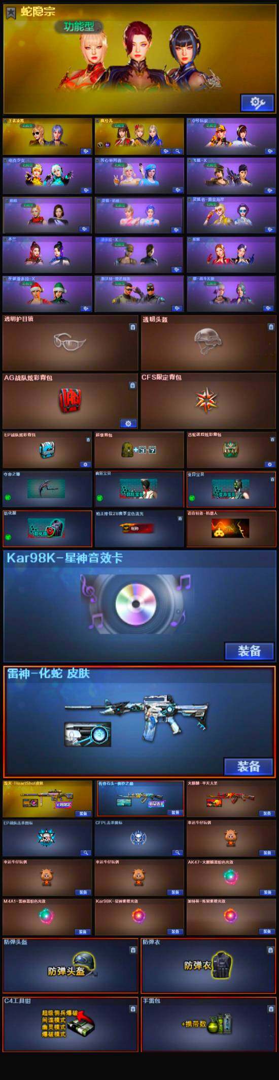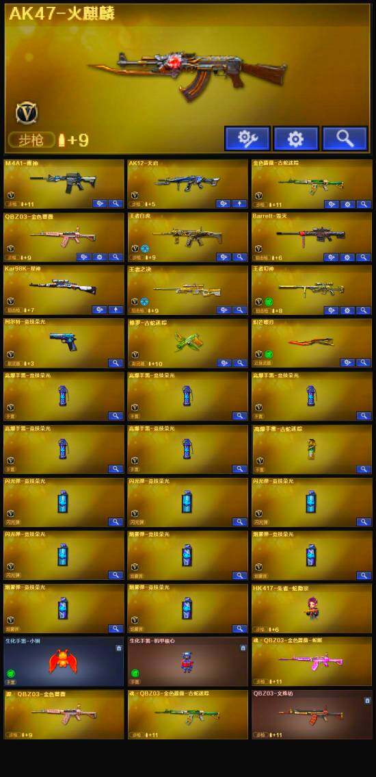 【英雄级武器】:柯尔特-竞技荣光,高爆手雷-竞技荣光*5,烟雾弹-竞技荣光*4,闪光弹-竞技荣光*4,QBZ03-金色蔷薇,金色蔷薇-古蛇迷踪,M4A1-雷神,AK47-火麒麟,AK12-天启,Barrett-毁灭,Kar98K-星神,修罗-古蛇迷踪,炽芒蝶刃
