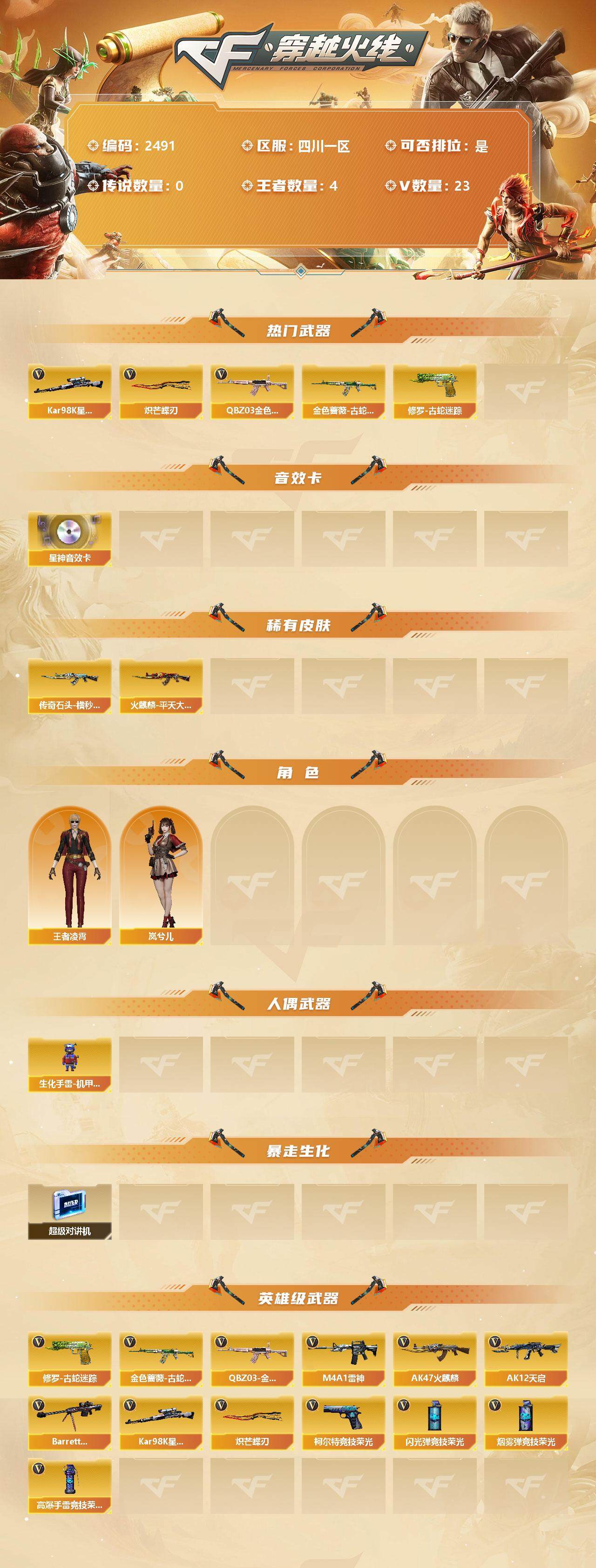 [12127774]【商品标题】:四川一区-23V-4王者-0炫金 【热门武器】:QBZ03-金色蔷薇,金色蔷薇-古蛇迷踪,修罗-古蛇迷踪,Kar98K-星神,炽芒蝶刃 【音效卡】:Kar98K-星神音效卡 【稀有皮肤】:传奇石头-横秒之巅,火麒麟-平天大圣 【角色】:王者凌霄,岚兮儿 【人偶武器】:生化手雷-机甲核心 【暴走生化】:超级对讲机 【英雄级武器】:柯尔特-竞技荣光,高爆手雷-竞技荣光*5,烟雾弹-竞技荣光*4,闪光弹-竞技荣光*4,QBZ03-金色蔷薇,金色蔷薇-古蛇迷踪,M4A1-雷神,AK47-火麒麟,AK12-天启,Barrett-毁灭,Kar98K-星神,修罗-古蛇迷踪,炽芒蝶刃 【特殊枪械】: