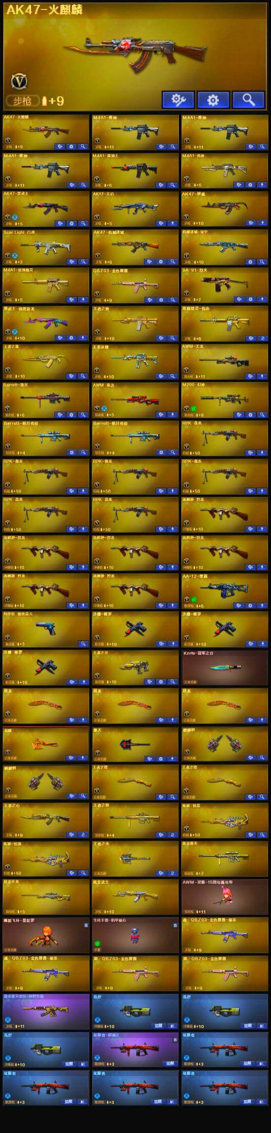 【英雄级武器】:柯尔特-竞技荣光,QBZ03-金色蔷薇,Scar Light-白虎,M4A1-雷神*3,M4A1-玫瑰精灵,M4A1-黑骑士,M4A1-死神,RPK-盘龙*6,汤姆逊-烈龙*6,AK47-火麒麟*2,AK47-黑武士,AK12-天启,AWM-天龙,Barrett-毁灭,AWM-裁决,AK47-机械迷城,AA-12-雷霆,M200-幻神,AK47-黑鲨,黑武士-锦绣游龙,AK-47-猩红传说,M4A1-赤狱骑士,沙鹰-修罗*3,麒麟刺*2,擎天,龙啸,屠龙*3