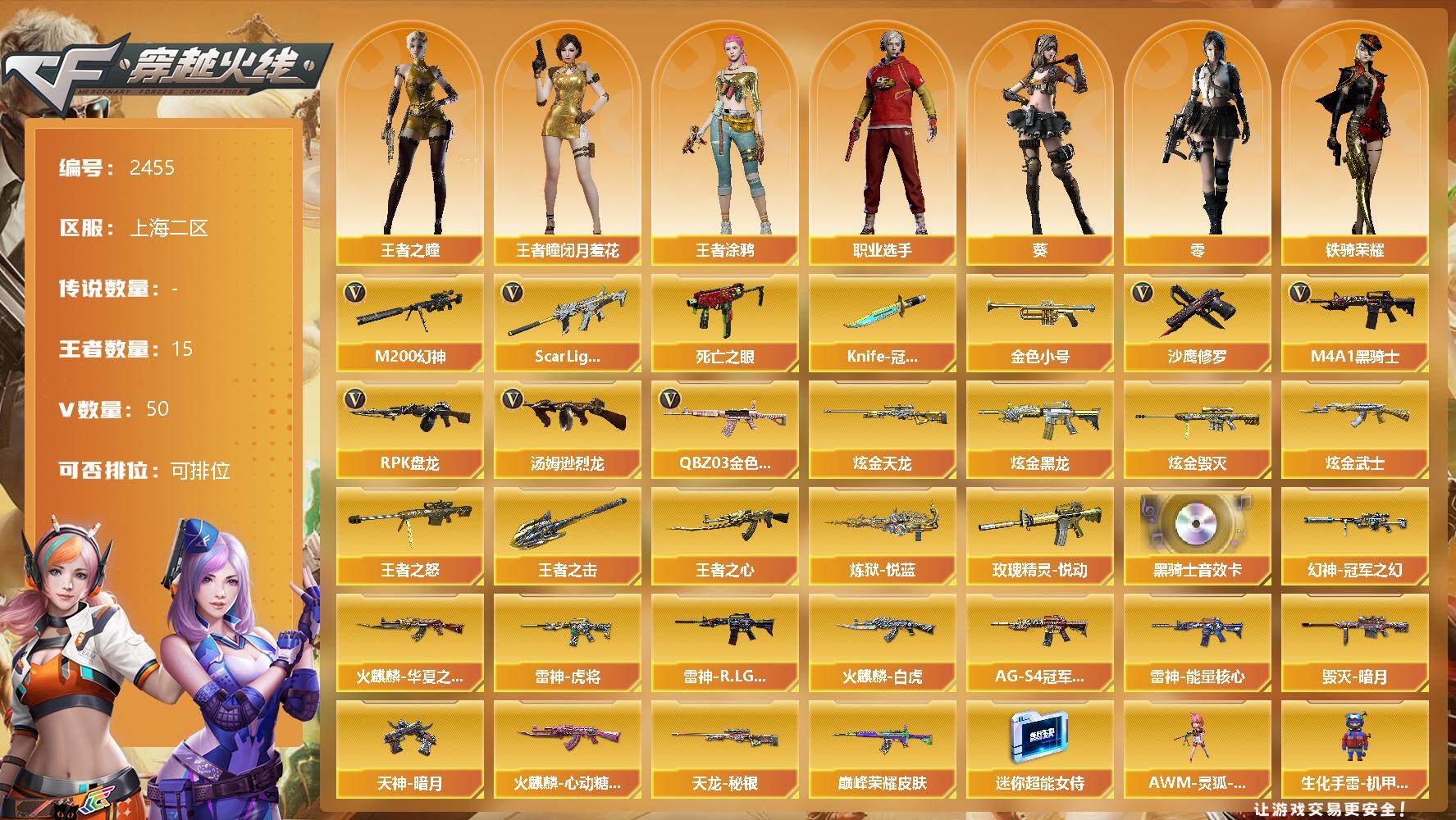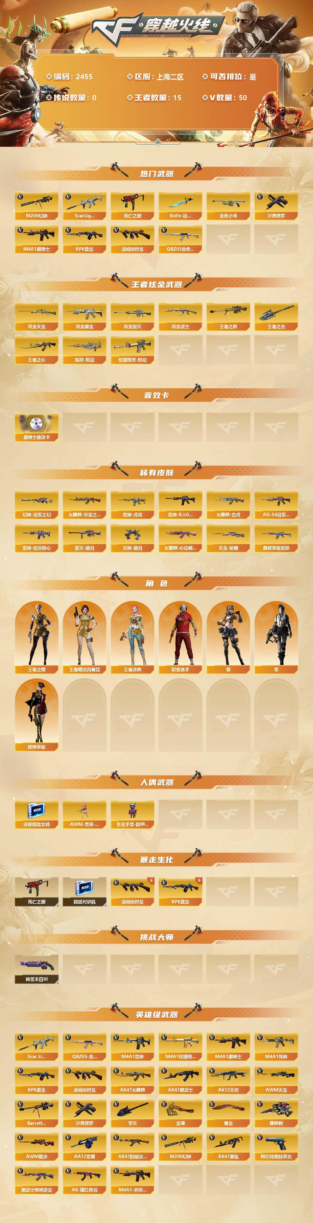 [12119812]【商品标题】:上海二区-50V-15王者-5炫金 【热门武器】:QBZ03-金色蔷薇,Scar Light-白虎,M200-幻神,死亡之眼,金色小号,M4A1-黑骑士,汤姆逊-烈龙*6,RPK-盘龙*6,沙鹰-修罗*3,Knife-冠军之刃 【王者炫金武器】:炫金天龙,炫金黑龙*2,炫金毁灭,炫金武士,炼狱-悦蓝*2,玫瑰精灵-悦动,王者之怒,王者之心,王者之击 【音效卡】:M4A1-黑骑士音效卡 【稀有皮肤】:幻神-冠军之幻,QBZ03-巅峰荣耀皮肤,雷神-能量核心,雷神-虎将*2,雷神-R.LGD-CFPLS18冠军,火麒麟-华夏之心,火麒麟-白虎,火麒麟-心动糖果,黑骑士-AG-S4冠军典藏,毁灭-暗月,天龙-秘银,天神-暗月 【角色】:王者-瞳-闭月羞花,王者之瞳,王者涂鸦,零,葵,铁骑荣耀,职业选手 【人偶武器】:AWM-灵狐-15周年嘉年华,迷你超能女侍,生化手雷-机甲核心 【暴走生化】:死亡之眼,超级对讲机 【挑战大师】:神圣爆裂者-末日III 【英雄级武器】:柯尔特-竞技荣光,QBZ03-金色蔷薇,Scar Light-白虎,M4A1-雷神*3,M4A1-玫瑰精灵,M4A1-黑骑士,M4A1-死神,RPK-盘龙*6,汤姆逊-烈龙*6,AK47-火麒麟*2,AK47-黑武士,AK12-天启,AWM-天龙,Barrett-毁灭,AWM-裁决,AK47-机械迷城,AA-12-雷霆,M200-幻神,AK47-黑鲨,黑武士-锦绣游龙,AK-47-猩红传说,M4A1-赤狱骑士,沙鹰-修罗*3,麒麟刺*2,擎天,龙啸,屠龙*3 【特殊枪械】:1白虎,1黑骑士,6烈龙,6盘龙