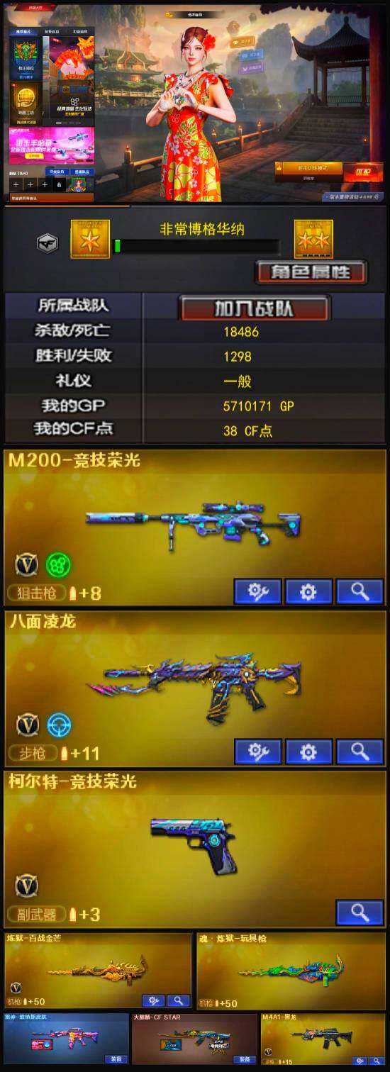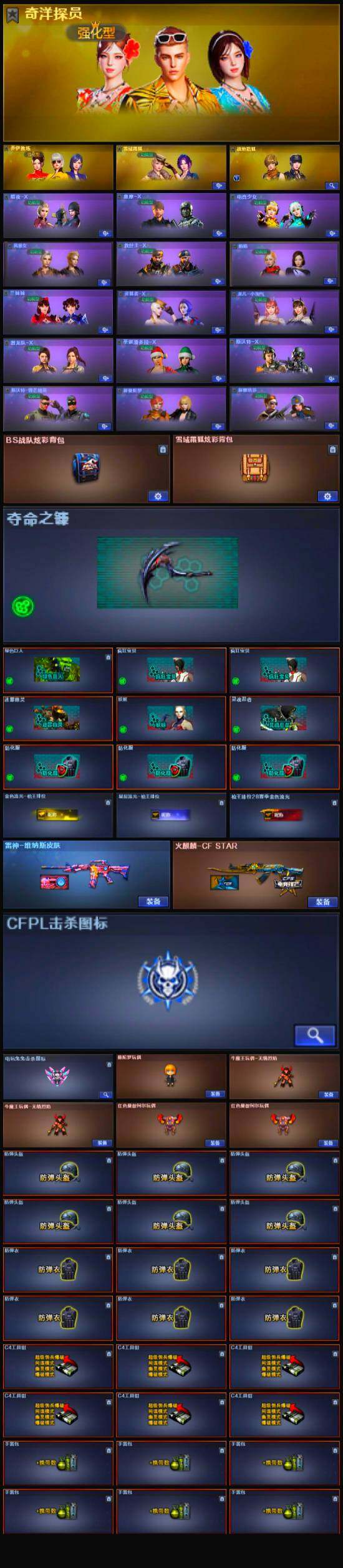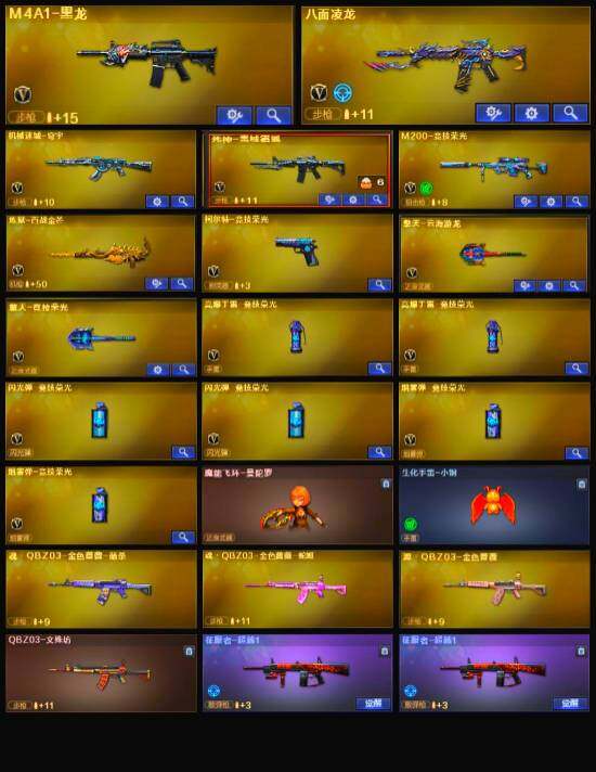 【英雄级武器】:M200-竞技荣光,柯尔特-竞技荣光,擎天-竞技荣光,高爆手雷-竞技荣光*2,烟雾弹-竞技荣光*2,闪光弹-竞技荣光*2,八面凌龙,M4A1-黑龙,死神-雪域霜狐,AWM-昌龙,M4A1-赤狱骑士,擎天-云海游龙