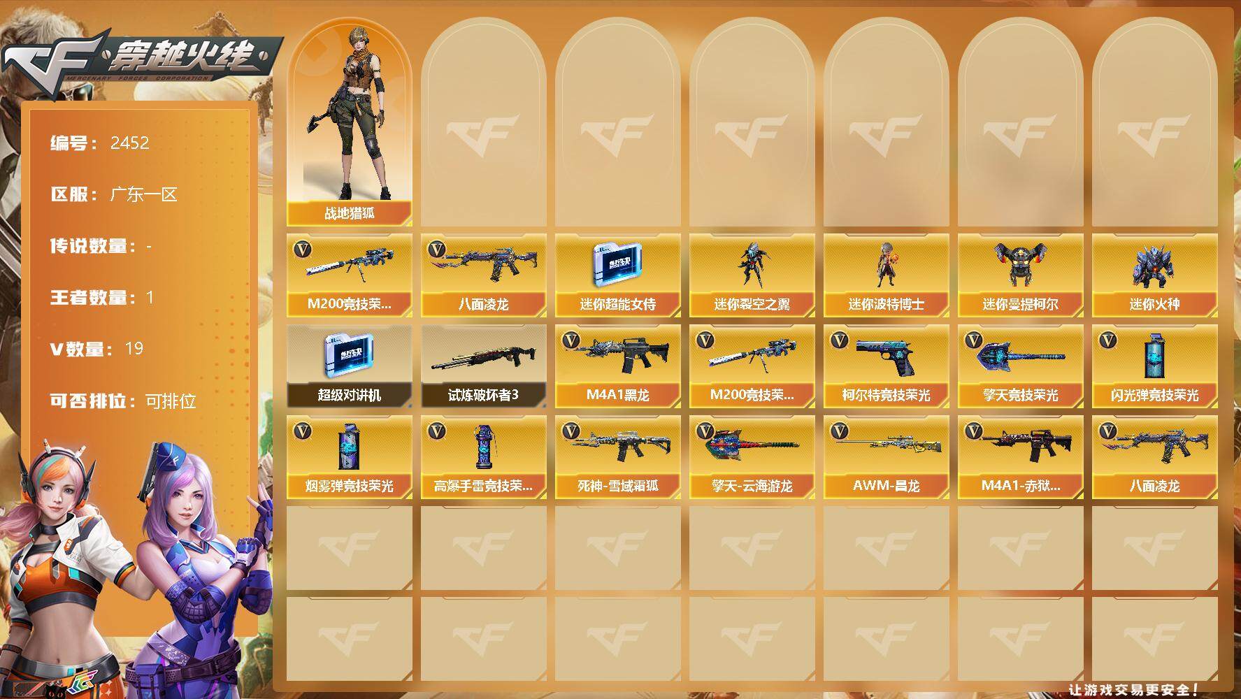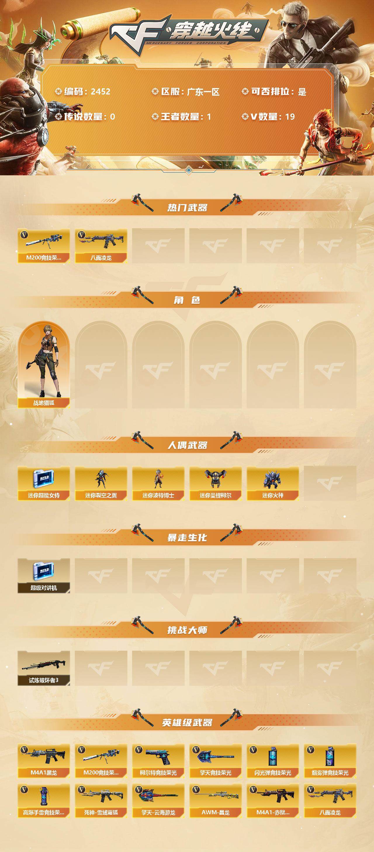 [12119982]【商品标题】:广东一区-19V-1王者-0炫金 【热门武器】:M200-竞技荣光,八面凌龙 【角色】:战地猎狐 【人偶武器】:迷你超能女侍,迷你裂空之翼*2,迷你波特博士*2,迷你曼提柯尔,迷你火种*2 【暴走生化】:超级对讲机 【挑战大师】:试炼破坏者III 【英雄级武器】:M200-竞技荣光,柯尔特-竞技荣光,擎天-竞技荣光,高爆手雷-竞技荣光*2,烟雾弹-竞技荣光*2,闪光弹-竞技荣光*2,八面凌龙,M4A1-黑龙,死神-雪域霜狐,AWM-昌龙,M4A1-赤狱骑士,擎天-云海游龙 【特殊枪械】: