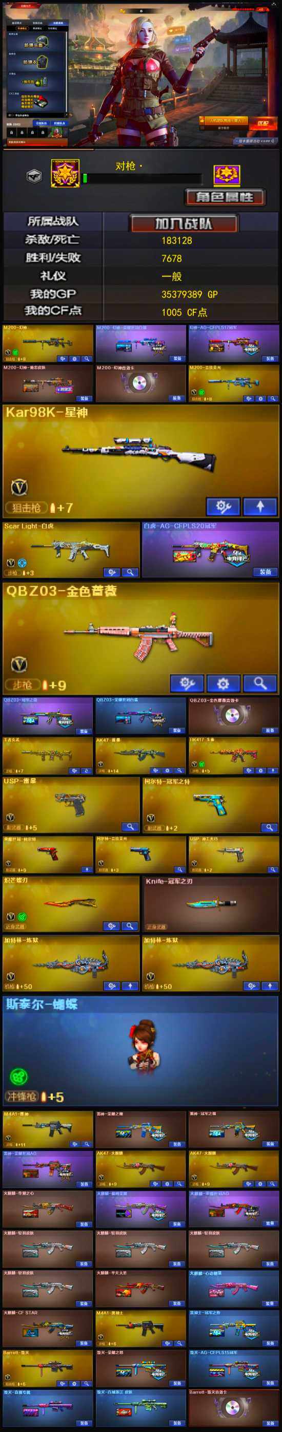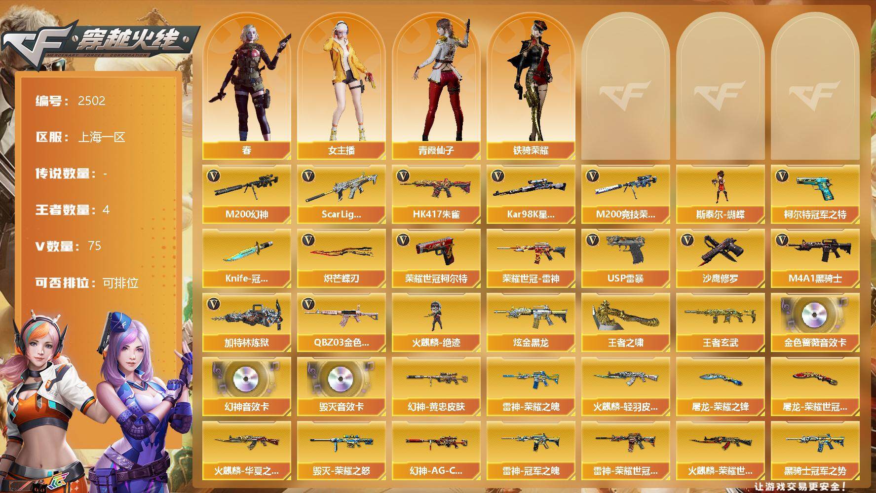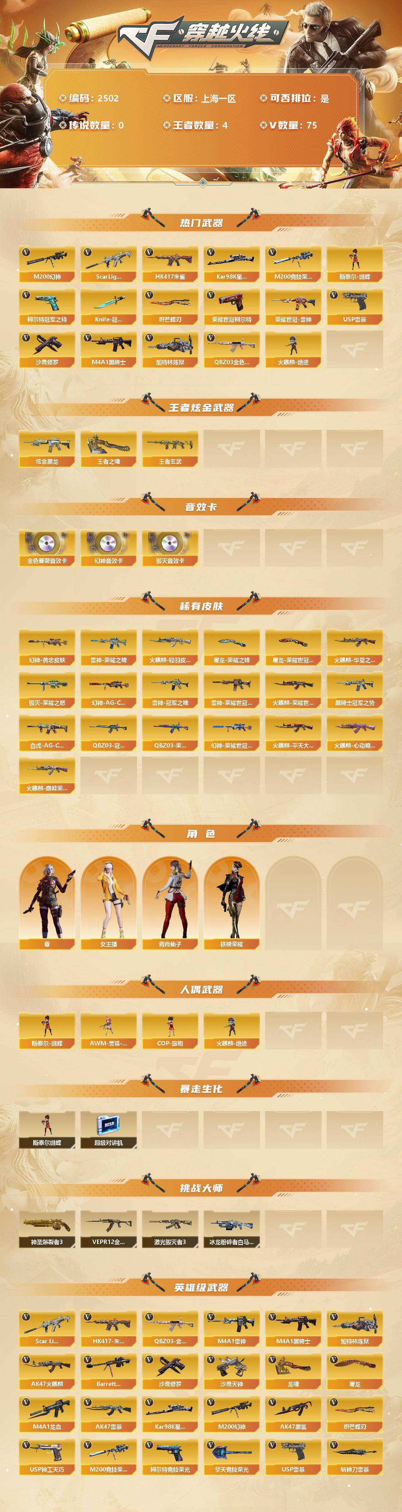 [12153061]【商品标题】:上海一区-75V-4王者-1炫金 【热门武器】:QBZ03-金色蔷薇,Scar Light-白虎,HK417-朱雀,M200-幻神,M200-竞技荣光,荣耀世冠-雷神,柯尔特-冠军之特,荣耀世冠-柯尔特,Kar98K-星神,M4A1-黑骑士,加特林-炼狱*2,斯泰尔-蝴蝶,火麒麟-绝迹*2,USP-雷暴,沙鹰-修罗,Knife-冠军之刃,炽芒蝶刃 【王者炫金武器】:炫金黑龙,王者玄武,王者之啸*2 【音效卡】:M200-幻神音效卡,Barrett-毁灭音效卡,QBZ03-金色蔷薇音效卡 【稀有皮肤】:M200-幻神-黄忠皮肤,幻神-AG-CFPLS17冠军,M200-幻神-荣耀世冠白鲨,白虎-AG-CFPLS20冠军,QBZ03-冠军之薇,QBZ03-荣耀世冠白鲨,雷神-荣耀之魄,雷神-冠军之魄,雷神-荣耀世冠AG,火麒麟-华夏之心,火麒麟-轻羽皮肤*4,火麒麟-平天大圣,火麒麟-荣耀世冠AG,火麒麟-巅峰荣耀,火麒麟-心动糖果,黑骑士-冠军之势,毁灭-荣耀之怒,屠龙-荣耀之锋*2,屠龙-荣耀世冠AG 【角色】:春,女主播,铁骑荣耀,青霞仙子 【人偶武器】:火麒麟-绝迹*2,斯泰尔-蝴蝶,AWM-灵狐-15周年嘉年华,COP-旗袍 【暴走生化】:斯泰尔-蝴蝶,超级对讲机 【挑战大师】:神圣爆裂者III,激光毁灭者III,VEPR-12-金魔,冰龙粉碎者-白马银枪 【英雄级武器】:USP-神工天巧,M200-竞技荣光,柯尔特-竞技荣光,擎天-竞技荣光,高爆手雷-竞技荣光,烟雾弹-竞技荣光,闪光弹-竞技荣光,AK47-雷暴,USP-雷暴,斩神刀-雷暴,荣耀世冠-雷神,荣耀世冠-柯尔特,烈火-动感闪耀,天神-动感闪耀,屠龙-动感闪耀,手雷-动感闪耀,QBZ03-金色蔷薇,Scar Light-白虎,HK417-朱雀,无影-神兵利器,M4A1-雷神,M4A1-黑骑士,加特林-炼狱*2,AK47-火麒麟*2,Barrett-毁灭,M4A1-龙血*2,Kar98K-星神,M200-幻神,AK47-黑鲨*3,黑骑士-海王,AK-47-猩红传说,柯尔特-冠军之特,沙鹰-天神,沙鹰-修罗,炽芒蝶刃,龙啸*4,屠龙*2 【特殊枪械】:蝴蝶斯泰尔+0烈龙,1白虎,1黑骑士,2炼狱,1蝴蝶斯泰尔