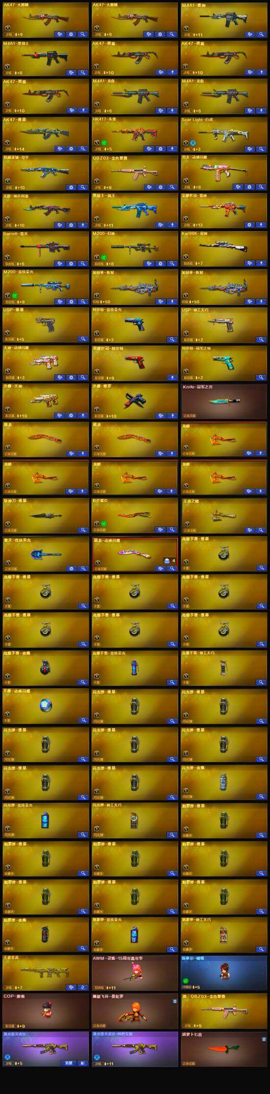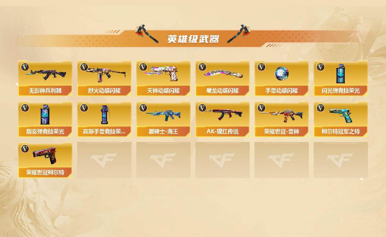 【英雄级武器】:USP-神工天巧,M200-竞技荣光,柯尔特-竞技荣光,擎天-竞技荣光,高爆手雷-竞技荣光,烟雾弹-竞技荣光,闪光弹-竞技荣光,AK47-雷暴,USP-雷暴,斩神刀-雷暴,荣耀世冠-雷神,荣耀世冠-柯尔特,烈火-动感闪耀,天神-动感闪耀,屠龙-动感闪耀,手雷-动感闪耀,QBZ03-金色蔷薇,Scar Light-白虎,HK417-朱雀,无影-神兵利器,M4A1-雷神,M4A1-黑骑士,加特林-炼狱*2,AK47-火麒麟*2,Barrett-毁灭,M4A1-龙血*2,Kar98K-星神,M200-幻神,AK47-黑鲨*3,黑骑士-海王,AK-47-猩红传说,柯尔特-冠军之特,沙鹰-天神,沙鹰-修罗,炽芒蝶刃,龙啸*4,屠龙*2