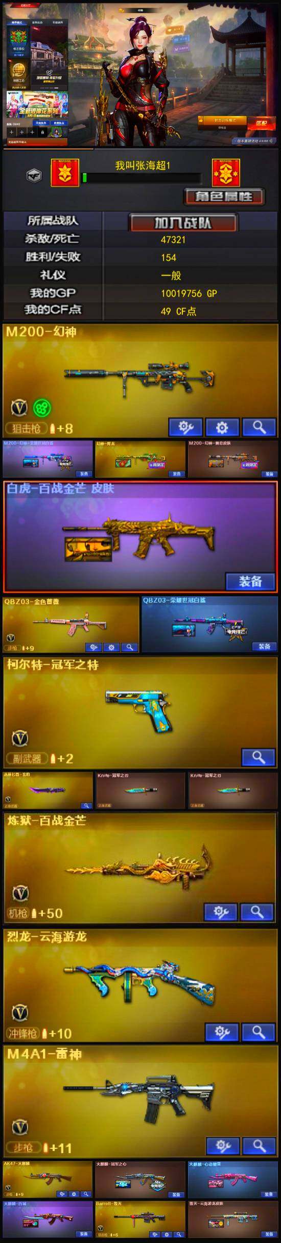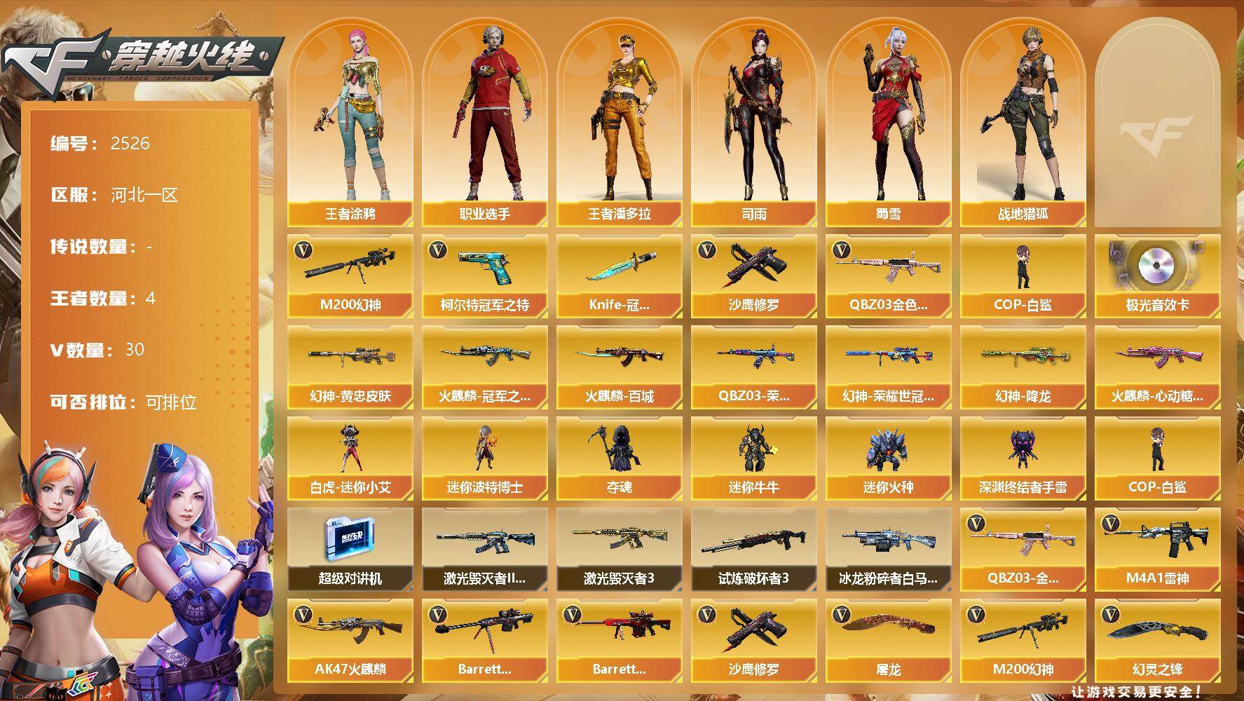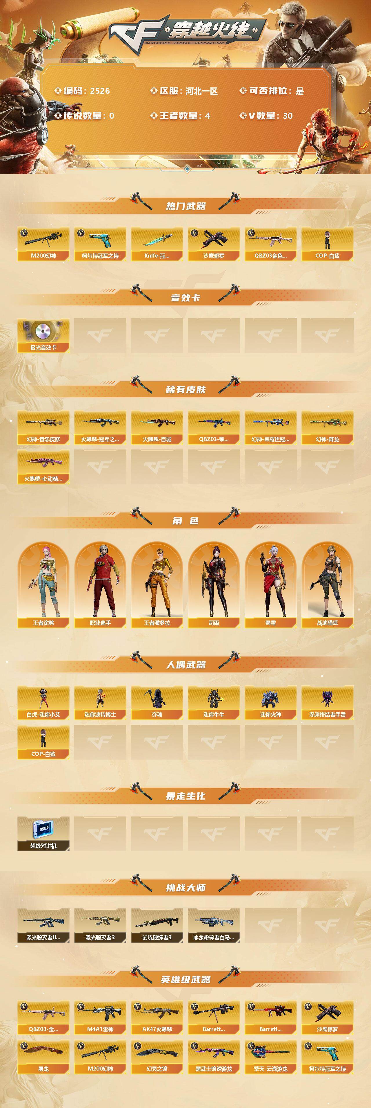 [12153701]【商品标题】:河北一区-30V-4王者-0炫金 【热门武器】:QBZ03-金色蔷薇,M200-幻神,柯尔特-冠军之特,COP-白鲨,沙鹰-修罗,Knife-冠军之刃*2 【音效卡】:Barrett-极光音效卡 【稀有皮肤】:M200-幻神-黄忠皮肤,幻神-降龙,M200-幻神-荣耀世冠白鲨,QBZ03-荣耀世冠白鲨,火麒麟-冠军之心,火麒麟-百城,火麒麟-心动糖果 【角色】:王者涂鸦,王者潘多拉,司雨,战地猎狐,蜀雪,职业选手 【人偶武器】:COP-白鲨,白虎-迷你小艾,迷你波特博士,夺魂,迷你牛牛,迷你火种,深渊终结者手雷 【暴走生化】:超级对讲机 【挑战大师】:试炼破坏者III,激光毁灭者III,激光毁灭者III-白马银枪*2,冰龙粉碎者-白马银枪 【英雄级武器】:幻灵之锋,QBZ03-金色蔷薇,M4A1-雷神,AK47-火麒麟,Barrett-毁灭,Barrett-极光,M200-幻神,黑武士-锦绣游龙,柯尔特-冠军之特,沙鹰-修罗,屠龙,擎天-云海游龙 【特殊枪械】: