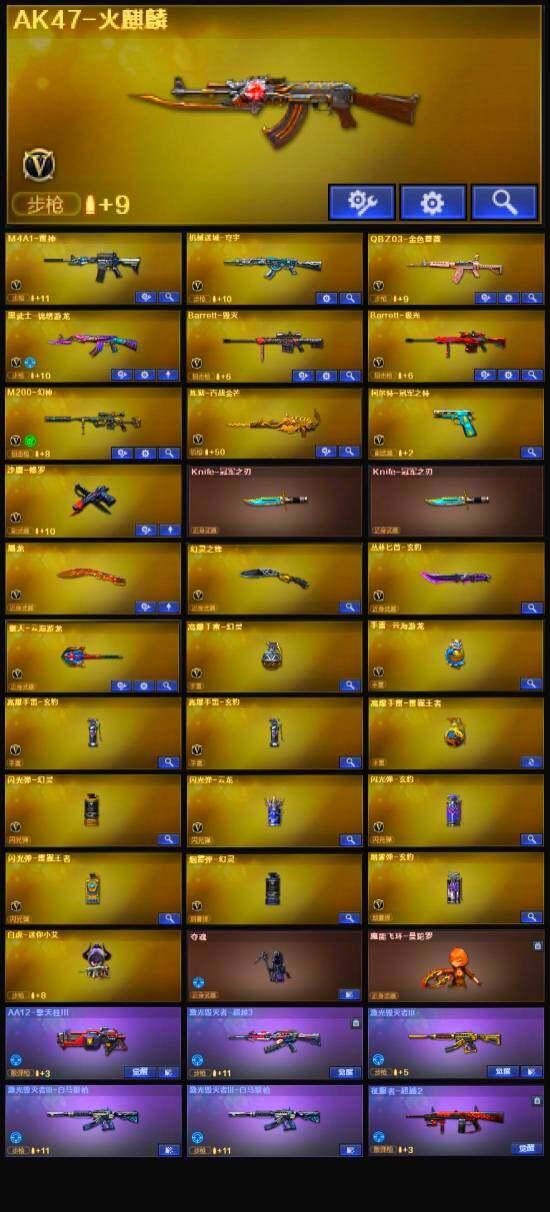 【英雄级武器】:幻灵之锋,QBZ03-金色蔷薇,M4A1-雷神,AK47-火麒麟,Barrett-毁灭,Barrett-极光,M200-幻神,黑武士-锦绣游龙,柯尔特-冠军之特,沙鹰-修罗,屠龙,擎天-云海游龙