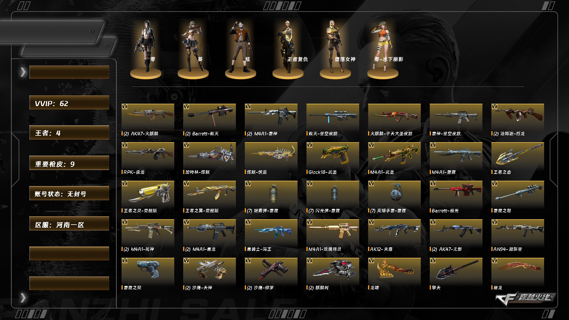 [12149562]皇冠Q 穿越火线(CF)-北部战区-河南一区 【Lv.100 高阶大元帅】 62V,4王者,毁灭星空/极光能量核心/火麒麟平天大圣/雷神能量核心/雷神星空/黑龙能量核心/死神秘银/天启暗月/修罗能量核心/_零/_葵/_炫/Barrett-毁灭(2)/Barrett-极光/雷霆之怒/M4A1-雷神(2)/M4A1-死神(2)/M4A1-雷神音效卡/Barrett-毁灭音效卡 【重要角色】_零/_葵/_炫/王者复仇/堕落女神/零-水下丽影 【传说武器】 【英雄武器】Barrett-毁灭(2)/Barrett-极光/雷霆之怒/M4A1-雷神(2)/M4A1-死神(2)/M4A1-黑龙(2)/黑骑士-海王/M4A1-武圣/M4A1-雷霆/M4A1-玫瑰精灵/AK12-天启/AK47-火麒麟(2)/AK47-无影(2)/AN94-超新星/王者之翼-觉醒版/RPK-盘龙/汤姆逊-烈龙(2)/加特林-炼狱/王者之灵-觉醒版/雷霆之契/沙鹰-天神(2)/沙鹰-修罗(2)/Glock18-武圣/麒麟刺(2)/龙啸/擎天/屠龙/雷霆之锋/高爆手雷-雷霆(7)/烟雾弹-雷霆(7)/闪光弹-雷霆(7) 【王者武器】炼狱-悦蓝/王者之击 【小人枪】M37-葵 【其他重要武器】M4A1-十二生肖·龙-雷神/黑武士-能量核心/火麒麟-暗月/激光毁灭者III/AK47-苍龙(2)/M4A1-水枪-机甲核心/M4A1-圣诞2021(2)/9A-91-圣诞/M4A1-秘银赤龙(2)/9A91-平安夜/AK47-SS-枪王排位(2)/M4A1-樱花/G3A3-SS-枪王排位(2)/M14EBR-情人节2020(2)/M4A1-SS-枪王排位/AK12-枪王排位/黄金AK-47(3)/AK47枪王排位II(2)/AT15-万圣节/HK417-红龙/M4A1-紫狱/AK47-破空冰刃(3)/AK47-轮回/M4A1-破空冰刃/M4A1-肯德基(2)【重要武器皮肤】毁灭-星空/极光-能量核心/火麒麟-平天大圣/雷神-能量核心/雷神-星空/黑龙-能量核心/死神-秘银/天启-暗月/修罗-能量核心 【重要光效】王者之翼金色光效/AK47-火麒麟蓝色光效/M4A1-死神蓝色光效/AN94-超新星蓝色光效/AK12-天启蓝粉色光效/巴雷特-毁灭蓝色光效/沙鹰-修罗蓝色光效/加特林-炼狱蓝色光效/汤姆逊-烈龙蓝粉色光效/汤姆逊-烈龙蓝色光效/擎天蓝色光效/麒麟刺蓝色光效/龙啸蓝色光效 【重要音效卡】M4A1-雷神音效卡/Barrett-毁灭音效卡 【重要戒指】龙眼(死神)/龙眼(鹰)/金蛇戒/银蛇戒