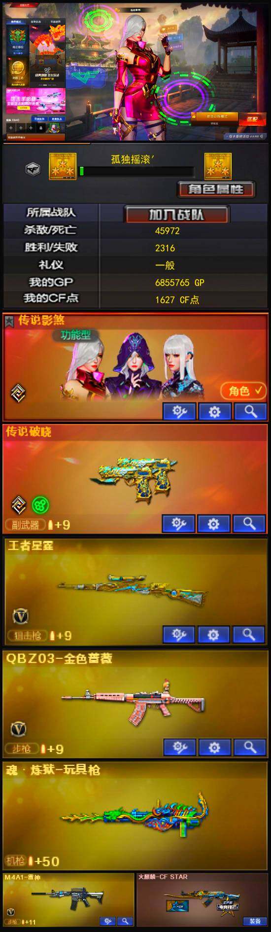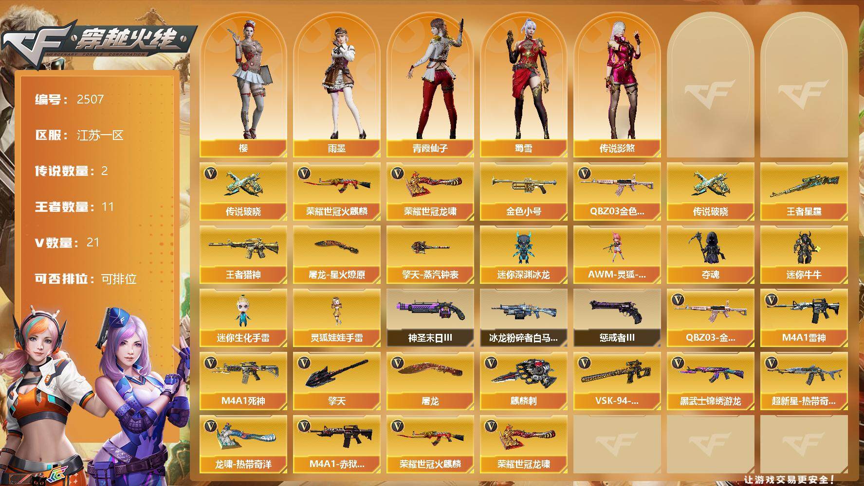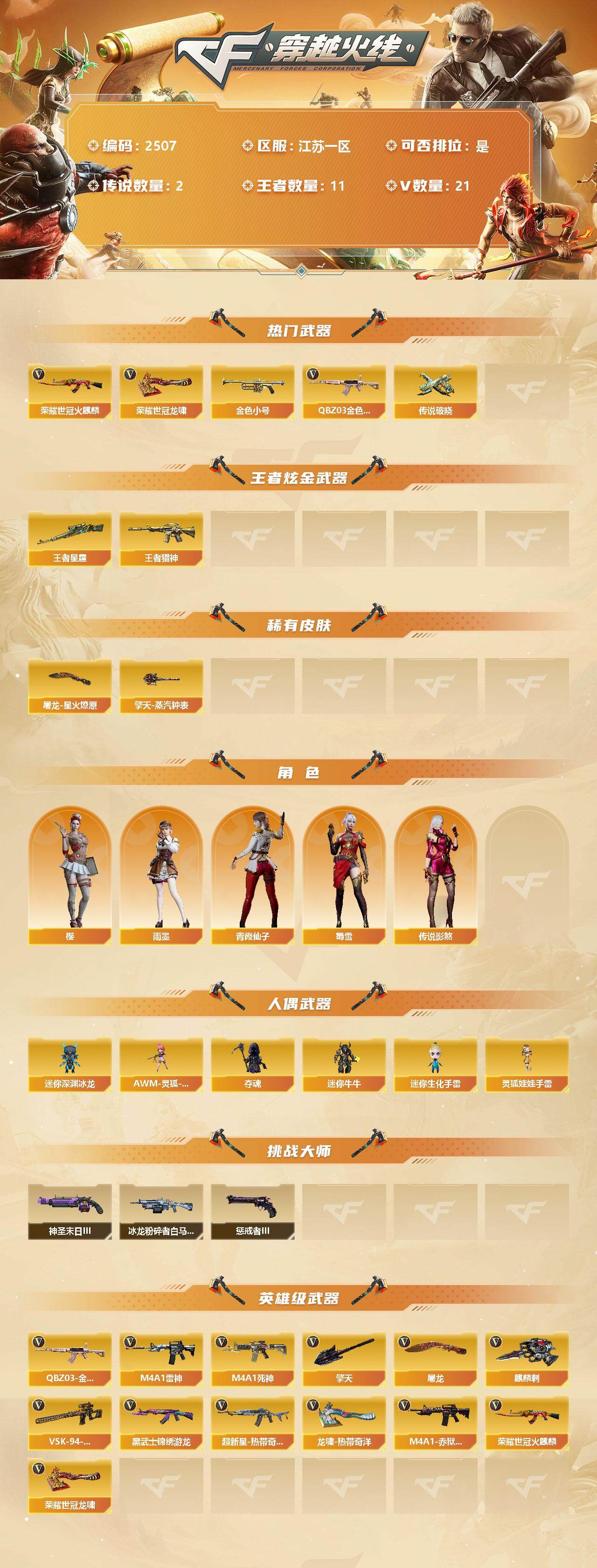[12153094]【商品标题】:江苏一区-21V-11王者-0炫金 【传说武器】:传说破晓 【传说角色】:传说影煞 【热门武器】:传说破晓,QBZ03-金色蔷薇,荣耀世冠-火麒麟,金色小号,荣耀世冠-龙啸 【王者炫金武器】:王者猎神,王者星霆 【稀有皮肤】:屠龙-星火燎原,擎天-蒸汽钟表 皮肤 【角色】:传说影煞,樱,雨墨,蜀雪,青霞仙子 【人偶武器】:AWM-灵狐-15周年嘉年华,迷你深渊冰龙,夺魂,迷你牛牛,迷你生化手雷,灵狐娃娃手雷 【挑战大师】:神圣爆裂者-末日III,惩戒者III,冰龙粉碎者-白马银枪 【英雄级武器】:荣耀世冠-火麒麟,荣耀世冠-龙啸,QBZ03-金色蔷薇,M4A1-雷神,M4A1-死神,VSK-94-金蚀,黑武士-锦绣游龙,超新星-热带奇洋,M4A1-赤狱骑士,麒麟刺,擎天,屠龙,龙啸-热带奇洋 【特殊枪械】: