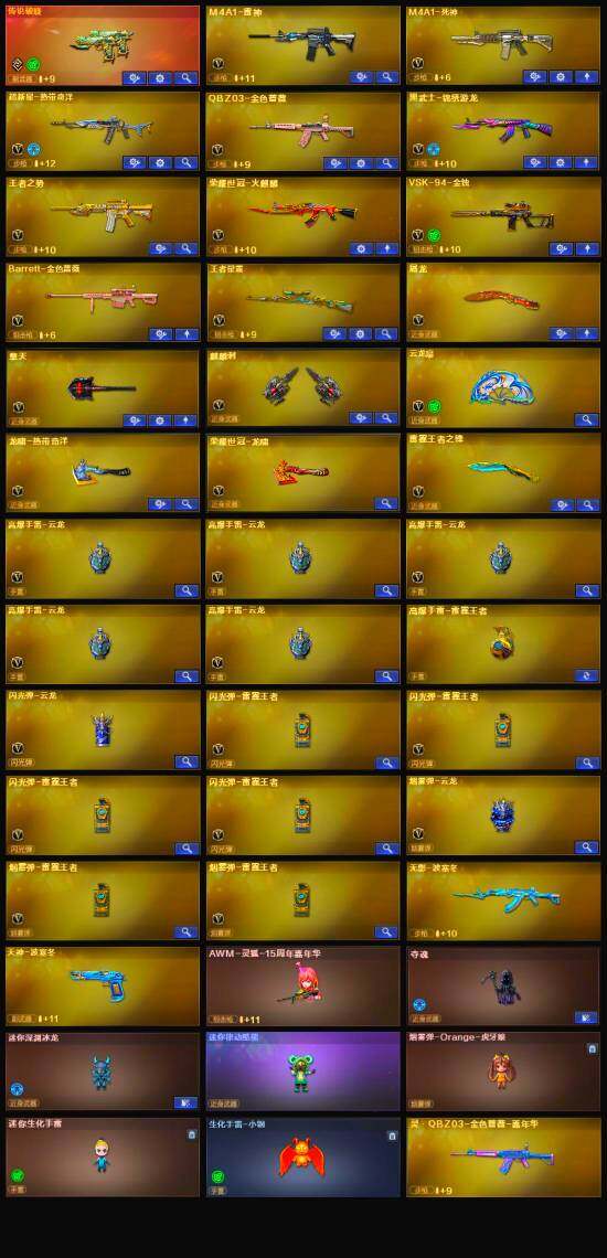 【英雄级武器】:荣耀世冠-火麒麟,荣耀世冠-龙啸,QBZ03-金色蔷薇,M4A1-雷神,M4A1-死神,VSK-94-金蚀,黑武士-锦绣游龙,超新星-热带奇洋,M4A1-赤狱骑士,麒麟刺,擎天,屠龙,龙啸-热带奇洋