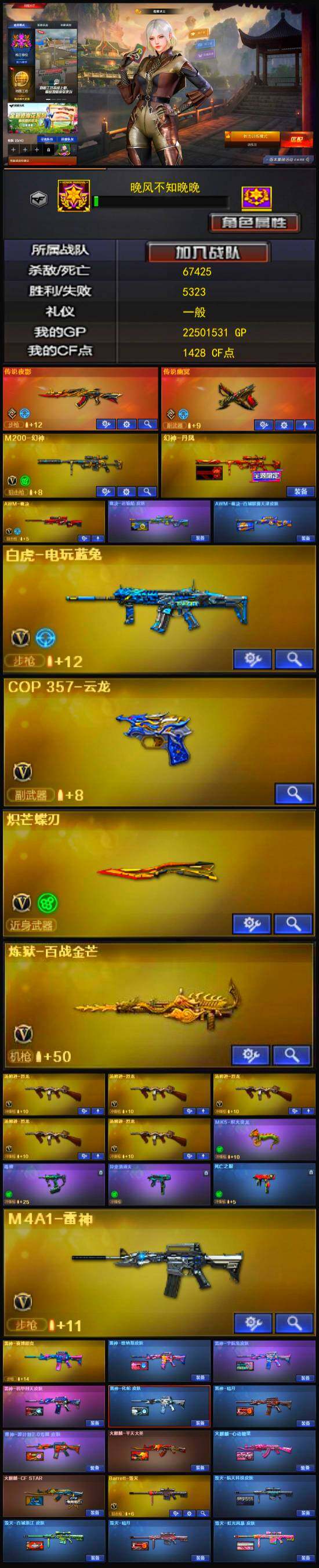 【热门武器】:传说夜影,传说幽冥,M200-幻神,金色蔷薇-古蛇迷踪,修罗-古蛇迷踪,死亡之眼,白虎-电玩蓝兔,C.A.T,毒蜂,汤姆逊-烈龙*5,MK5-炽火炎龙,沙鹰-修罗*2,炽芒蝶刃