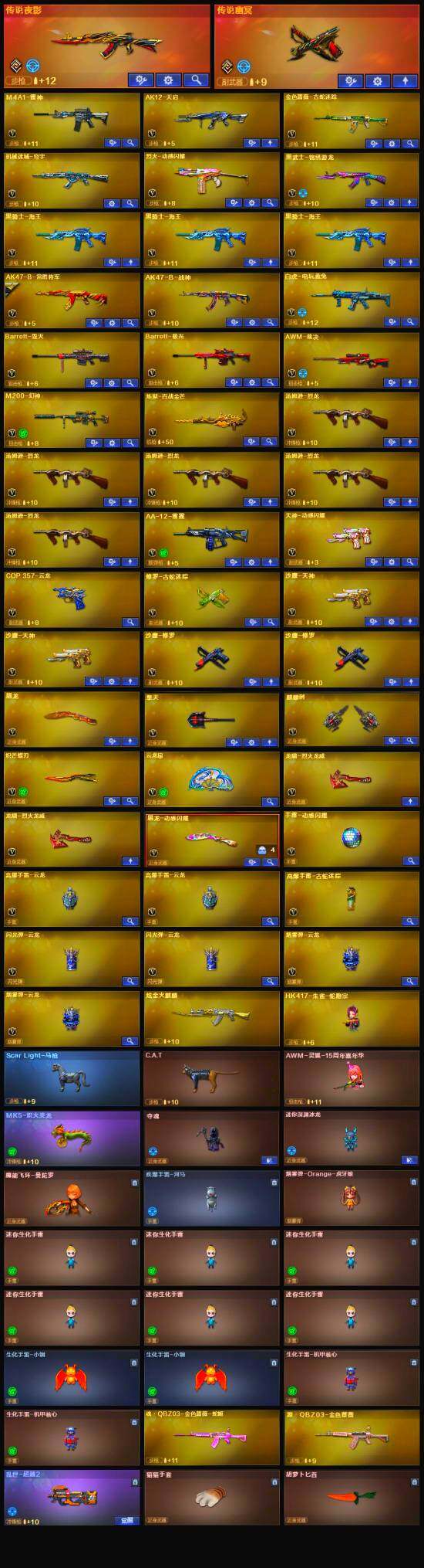 【英雄级武器】:COP 357-云龙,烈火-动感闪耀,天神-动感闪耀,屠龙-动感闪耀,手雷-动感闪耀,金色蔷薇-古蛇迷踪,白虎-电玩蓝兔,M4A1-雷神,汤姆逊-烈龙*5,AK12-天启,Barrett-毁灭,Barrett-极光,AWM-裁决,AA-12-雷霆,M200-幻神,黑武士-锦绣游龙,黑骑士-海王*3,AK47-B-战神,AK47-B-常胜将军,AWM-昌龙,M4A1-赤狱骑士,修罗-古蛇迷踪,沙鹰-天神*2,沙鹰-修罗*2,炽芒蝶刃,麒麟刺,擎天,屠龙