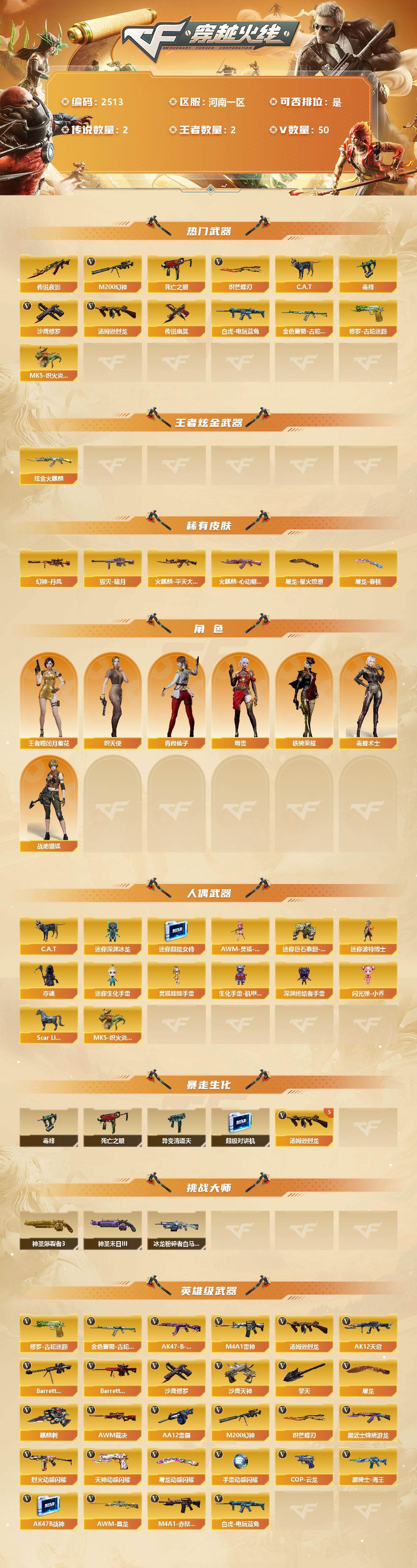 [12153232]【商品标题】:河南一区-50V-2王者-1炫金 【传说武器】:传说夜影,传说幽冥 【热门武器】:传说夜影,传说幽冥,M200-幻神,金色蔷薇-古蛇迷踪,修罗-古蛇迷踪,死亡之眼,白虎-电玩蓝兔,C.A.T,毒蜂,汤姆逊-烈龙*5,MK5-炽火炎龙,沙鹰-修罗*2,炽芒蝶刃 【王者炫金武器】:炫金火麒麟 【稀有皮肤】:幻神-丹凤,火麒麟-平天大圣,火麒麟-心动糖果,毁灭-暗月,屠龙-星火燎原,屠龙-春桃 皮肤 【角色】:王者-瞳-闭月羞花,毒蝰术士,战地猎狐,蜀雪,炽天使,铁骑荣耀,青霞仙子 【人偶武器】:MK5-炽火炎龙,AWM-灵狐-15周年嘉年华,Scar Light-马枪,C.A.T,迷你深渊冰龙,迷你超能女侍,迷你巨石泰坦-魔花研究所,迷你波特博士,夺魂,迷你生化手雷*6,灵狐娃娃手雷,生化手雷-机甲核心*2,深渊终结者手雷,闪光弹-小乔 【暴走生化】:毒蜂,死亡之眼,异变清道夫,超级对讲机 【挑战大师】:神圣爆裂者III,神圣爆裂者-末日III,冰龙粉碎者-白马银枪 【英雄级武器】:COP 357-云龙,烈火-动感闪耀,天神-动感闪耀,屠龙-动感闪耀,手雷-动感闪耀,金色蔷薇-古蛇迷踪,白虎-电玩蓝兔,M4A1-雷神,汤姆逊-烈龙*5,AK12-天启,Barrett-毁灭,Barrett-极光,AWM-裁决,AA-12-雷霆,M200-幻神,黑武士-锦绣游龙,黑骑士-海王*3,AK47-B-战神,AK47-B-常胜将军,AWM-昌龙,M4A1-赤狱骑士,修罗-古蛇迷踪,沙鹰-天神*2,沙鹰-修罗*2,炽芒蝶刃,麒麟刺,擎天,屠龙 【特殊枪械】:5烈龙