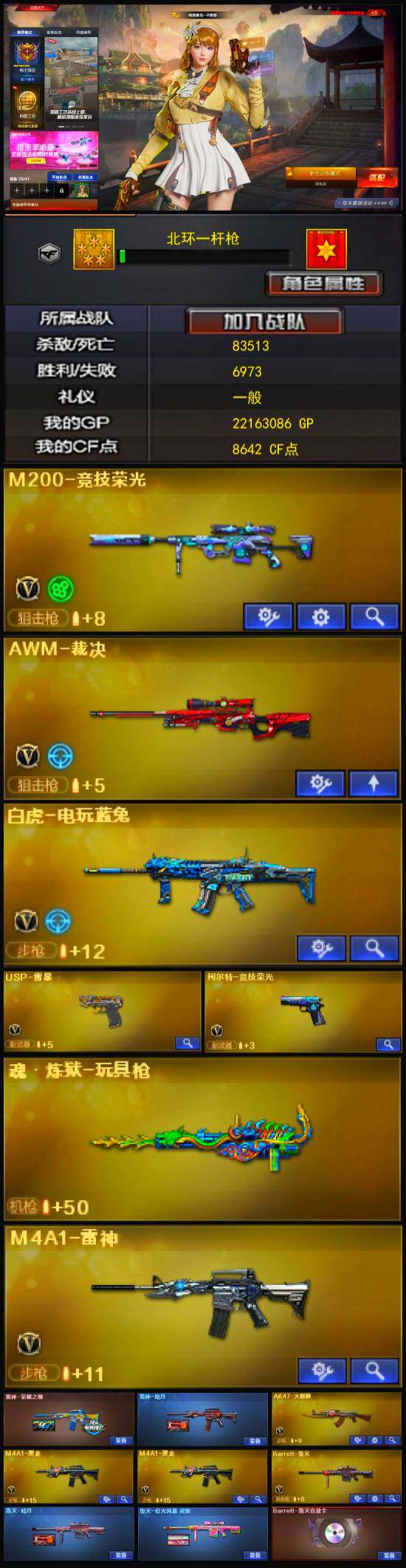 【热门武器】:M200-竞技荣光,白虎-电玩蓝兔,USP-雷暴