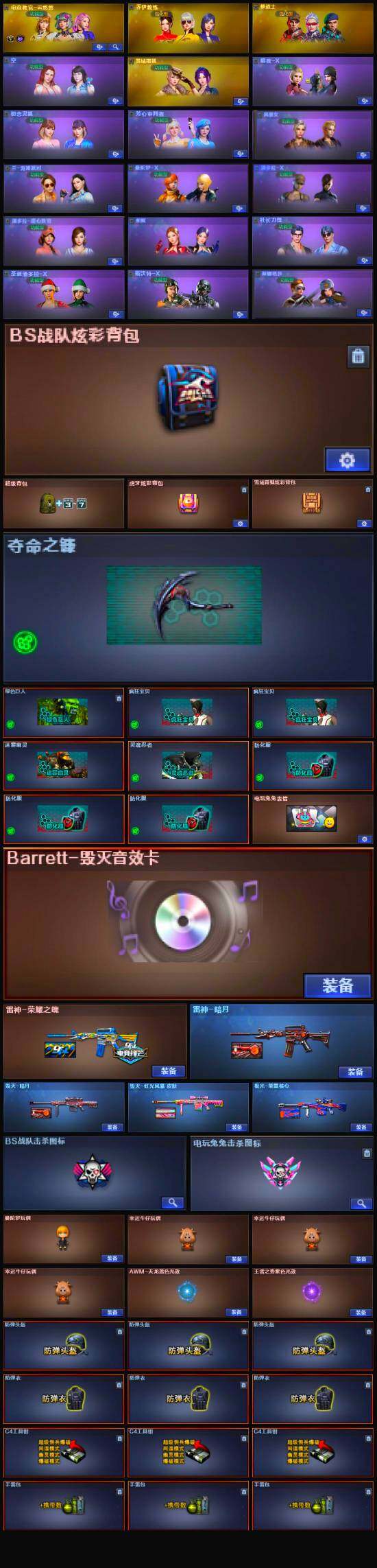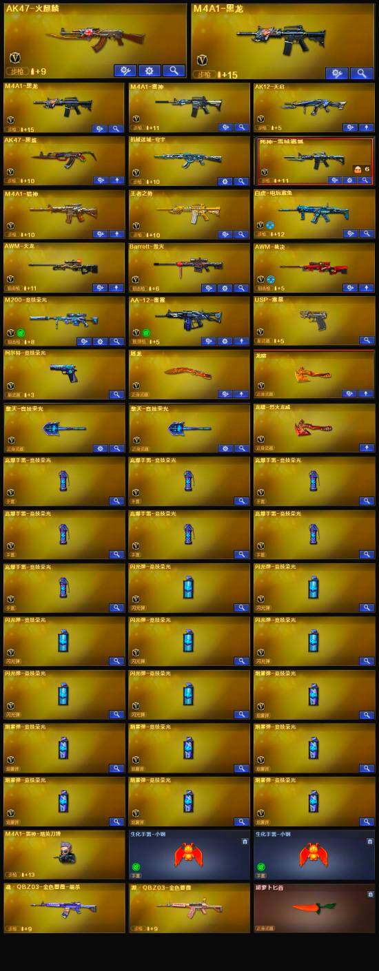【英雄级武器】:M200-竞技荣光,柯尔特-竞技荣光,擎天-竞技荣光*2,高爆手雷-竞技荣光*7,烟雾弹-竞技荣光*7,闪光弹-竞技荣光*7,USP-雷暴,白虎-电玩蓝兔,M4A1-雷神,M4A1-黑龙*2,AK47-火麒麟,AK12-天启,AWM-天龙,Barrett-毁灭,AWM-裁决,AA-12-雷霆,AK47-黑鲨,M4A1-猎神,死神-雪域霜狐,AK-47-猩红传说,龙啸,屠龙